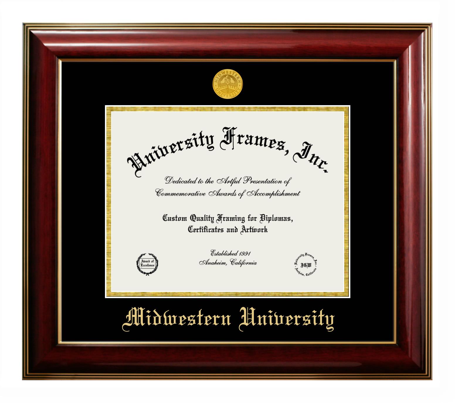Hey there, Midwestern University (Downers Grove, IL) grads. Congratulations on your accomplishment! Earning a degree is an achievement to be cherished forever. At University Frames, we create professional diploma frames for Midwestern University (Downers Grove, IL) grads and alumni, offering them an elegant and impressive way to treasure their hard-earned diploma for a lifetime. Each of our degree frames is handcrafted in the US and custom-sized to fit the official Midwestern University (Downers Grove, IL) diplomas. Customize your graduation frame using our easy and intuitive online design tool.