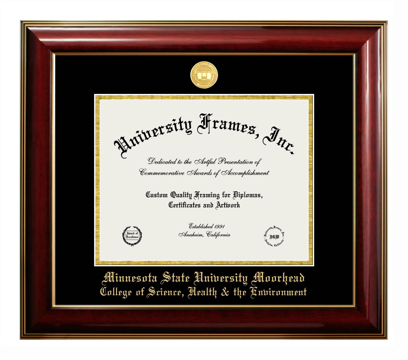 Hey there, Minnesota State University Moorhead College of Science, Health & the Environment grads. Congratulations on your accomplishment! Earning a degree is an achievement to be cherished forever. At University Frames, we create professional diploma frames for Minnesota State University Moorhead College of Science, Health & the Environment grads and alumni, offering them an elegant and impressive way to treasure their hard-earned diploma for a lifetime. Each of our degree frames is handcrafted in the US and custom-sized to fit the official Minnesota State University Moorhead College of Science, Health & the Environment diplomas. Customize your graduation frame using our easy and intuitive online design tool.