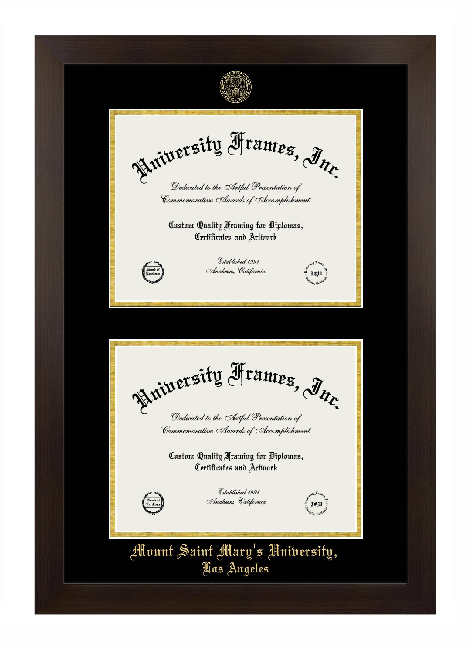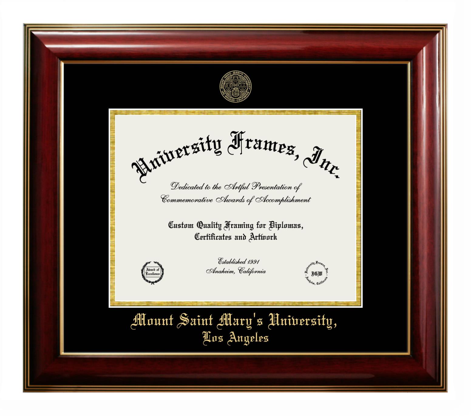 Hey there, Mount Saint Mary's University, Los Angeles grads. Congratulations on your accomplishment! Earning a degree is an achievement to be cherished forever. At University Frames, we create professional diploma frames for Mount Saint Mary's University, Los Angeles grads and alumni, offering them an elegant and impressive way to treasure their hard-earned diploma for a lifetime. Each of our degree frames is handcrafted in the US and custom-sized to fit the official Mount Saint Mary's University, Los Angeles diplomas. Customize your graduation frame using our easy and intuitive online design tool.