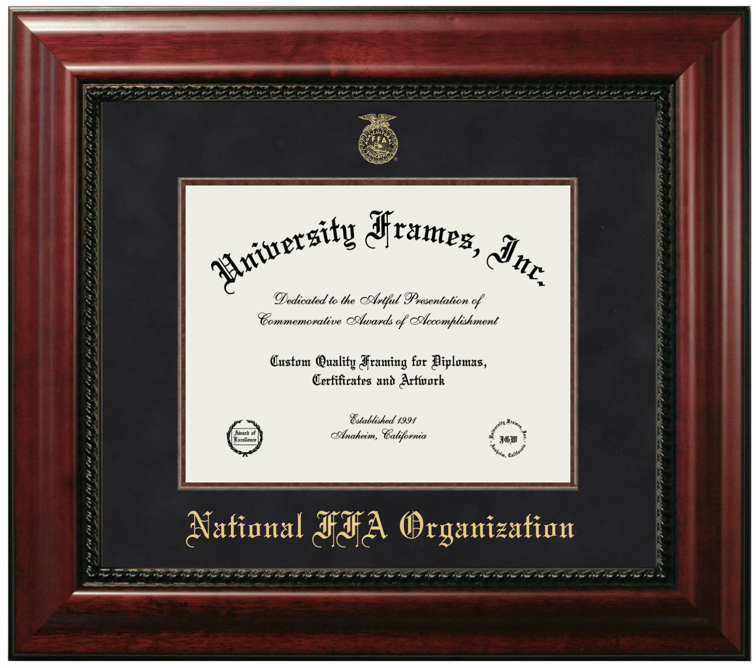Hey there, National FFA Organization grads. Congratulations on your accomplishment! Earning a degree is an achievement to be cherished forever. At University Frames, we create professional diploma frames for National FFA Organization grads and alumni, offering them an elegant and impressive way to treasure their hard-earned diploma for a lifetime. Each of our degree frames is handcrafted in the US and custom-sized to fit the official National FFA Organization diplomas. Customize your graduation frame using our easy and intuitive online design tool.
