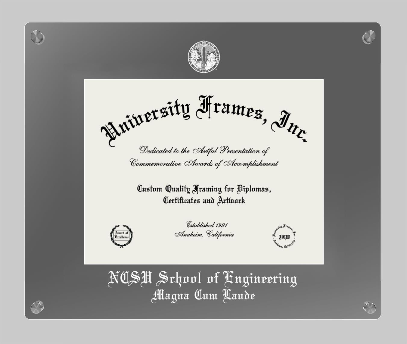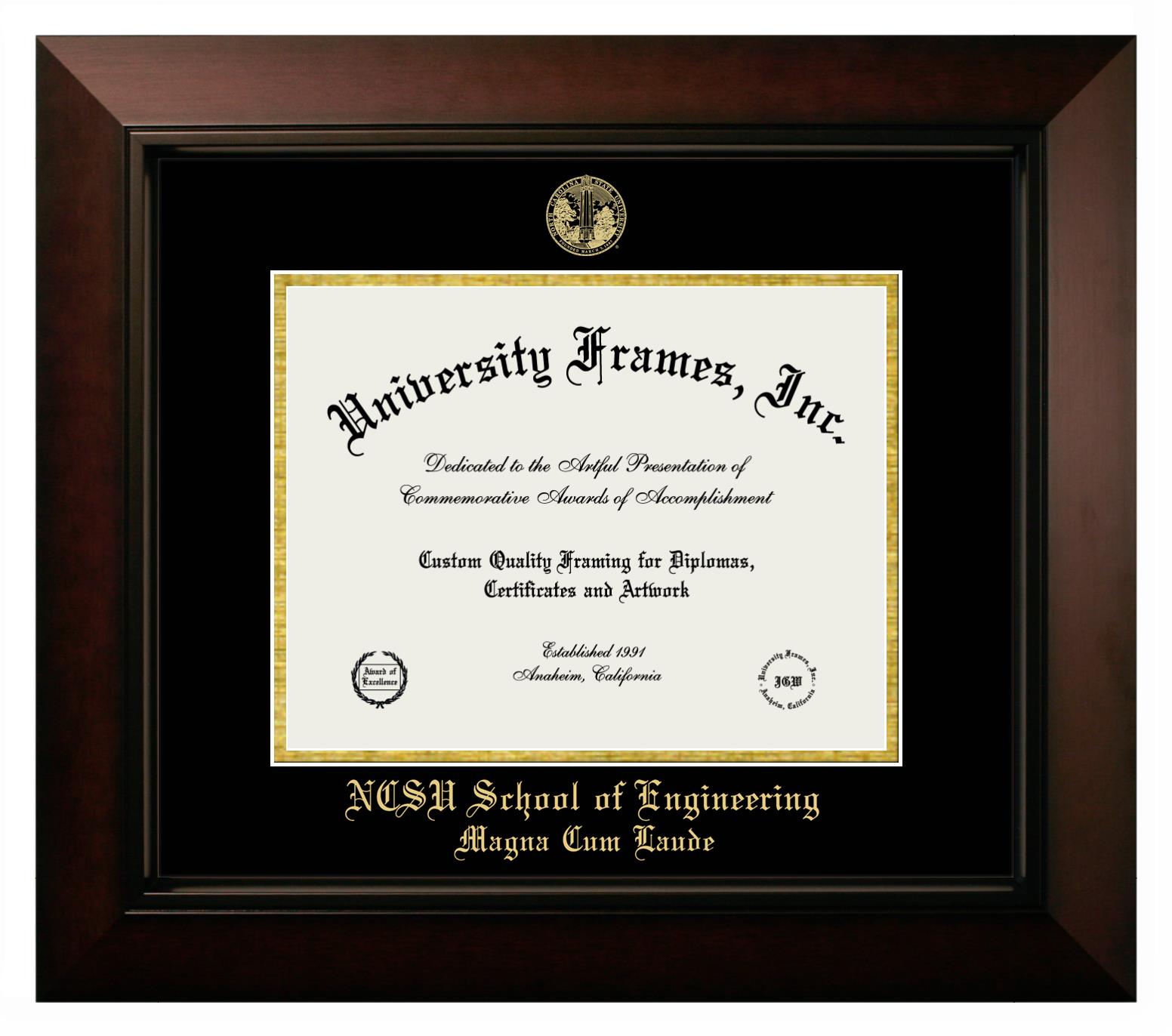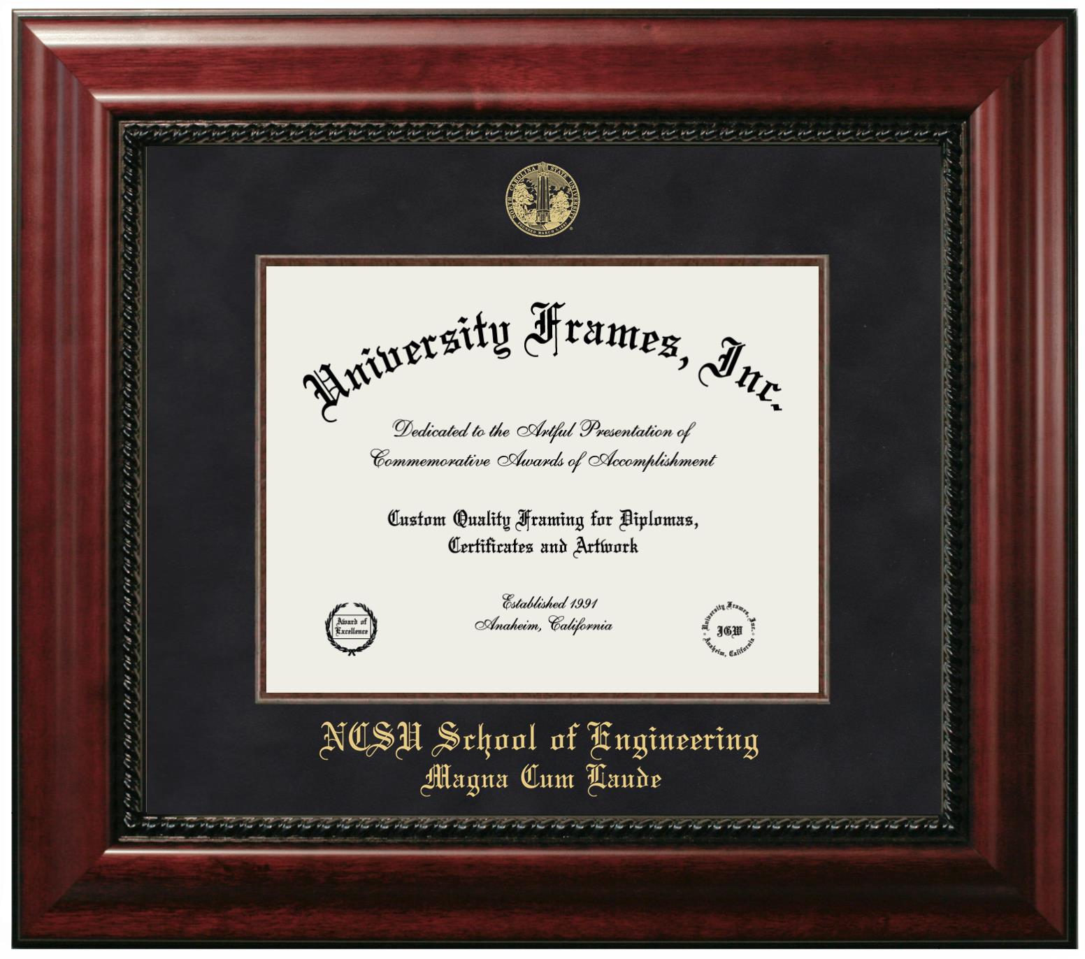 Hey there, NCSU School of Engineering (Magna Cum Laude) grads. Congratulations on your accomplishment! Earning a degree is an achievement to be cherished forever. At University Frames, we create professional diploma frames for NCSU School of Engineering (Magna Cum Laude) grads and alumni, offering them an elegant and impressive way to treasure their hard-earned diploma for a lifetime. Each of our degree frames is handcrafted in the US and custom-sized to fit the official NCSU School of Engineering (Magna Cum Laude) diplomas. Customize your graduation frame using our easy and intuitive online design tool.