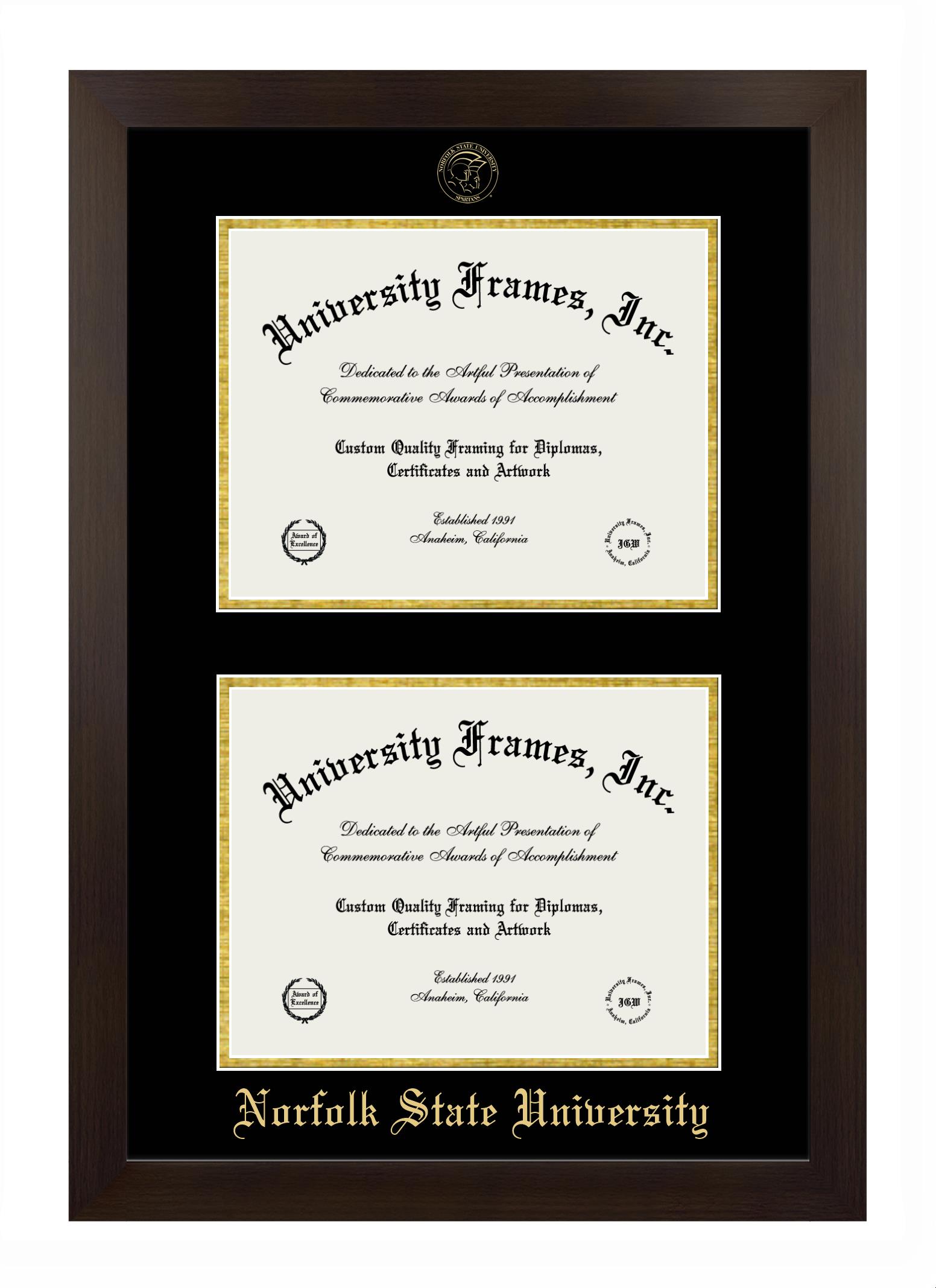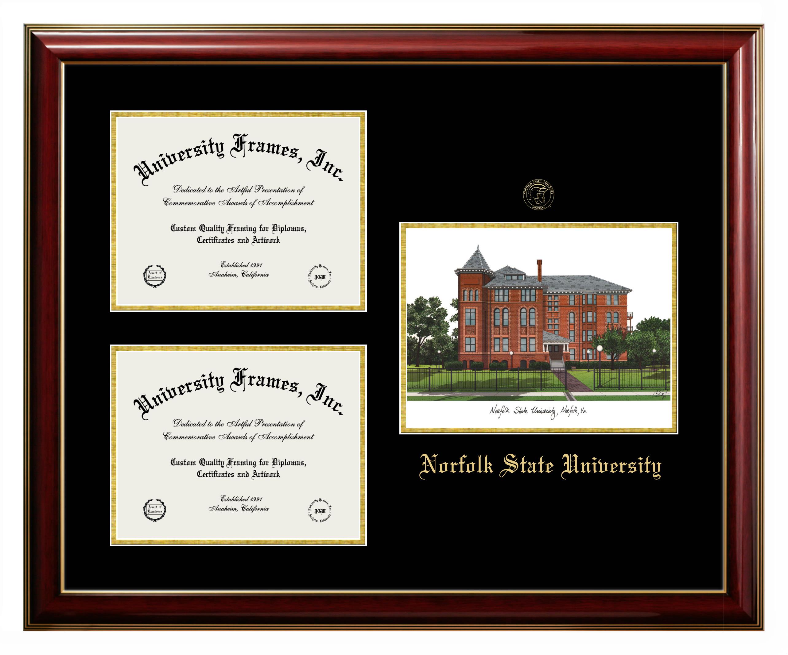 Hey there, Norfolk State University grads. Congratulations on your accomplishment! Earning a degree is an achievement to be cherished forever. At University Frames, we create professional diploma frames for Norfolk State University grads and alumni, offering them an elegant and impressive way to treasure their hard-earned diploma for a lifetime. Each of our degree frames is handcrafted in the US and custom-sized to fit the official Norfolk State University diplomas. Customize your graduation frame using our easy and intuitive online design tool.