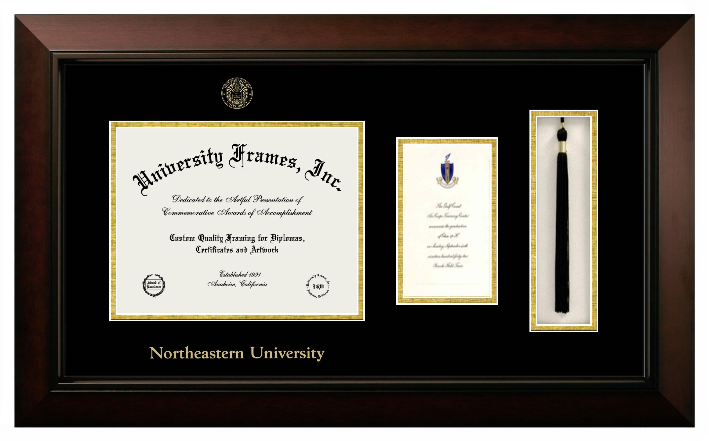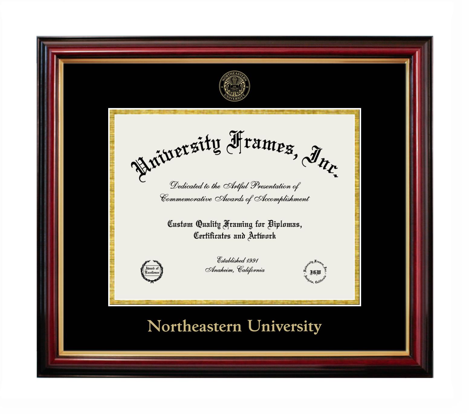 Hey there, Northeastern University grads. Congratulations on your accomplishment! Earning a degree is an achievement to be cherished forever. At University Frames, we create professional diploma frames for Northeastern University grads and alumni, offering them an elegant and impressive way to treasure their hard-earned diploma for a lifetime. Each of our degree frames is handcrafted in the US and custom-sized to fit the official Northeastern University diplomas. Customize your graduation frame using our easy and intuitive online design tool.