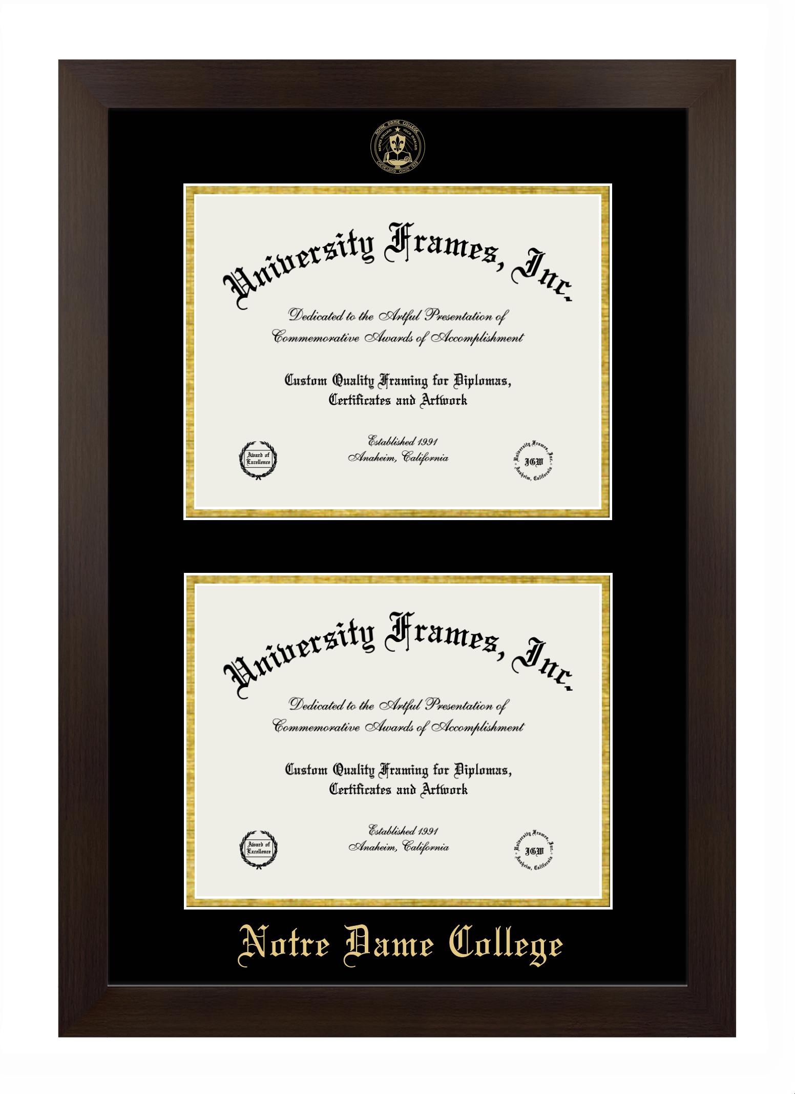 Hey there, Notre Dame College grads. Congratulations on your accomplishment! Earning a degree is an achievement to be cherished forever. At University Frames, we create professional diploma frames for Notre Dame College grads and alumni, offering them an elegant and impressive way to treasure their hard-earned diploma for a lifetime. Each of our degree frames is handcrafted in the US and custom-sized to fit the official Notre Dame College diplomas. Customize your graduation frame using our easy and intuitive online design tool.