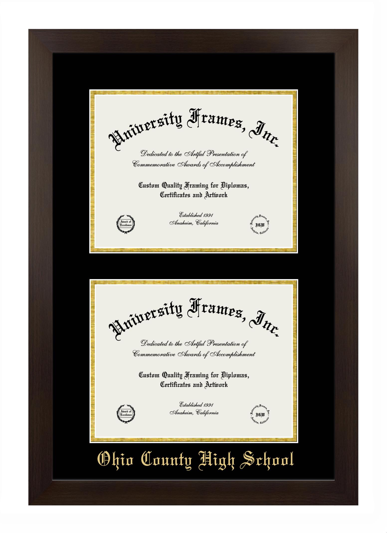 Hey there, Ohio County High School grads. Congratulations on your accomplishment! Earning a degree is an achievement to be cherished forever. At University Frames, we create professional diploma frames for Ohio County High School grads and alumni, offering them an elegant and impressive way to treasure their hard-earned diploma for a lifetime. Each of our degree frames is handcrafted in the US and custom-sized to fit the official Ohio County High School diplomas. Customize your graduation frame using our easy and intuitive online design tool.