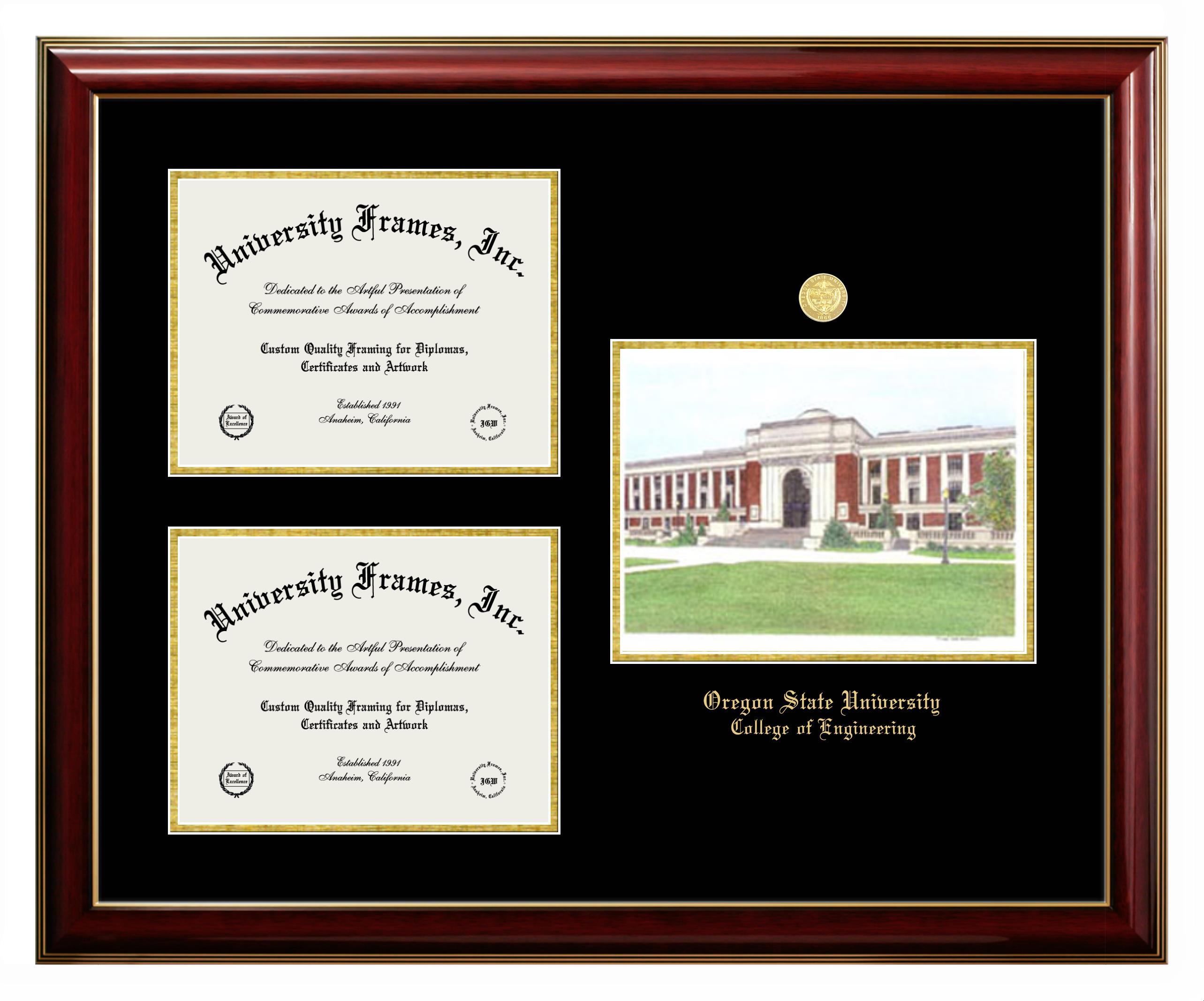 If you are looking for a professional diploma frame to showcase your achievement or are in search of a unique graduation gift for a recent grad or alum, you have come to the right place! We provide Oregon State University College of Engineering diploma frames that are handcrafted in the USA and sized to fit the official Oregon State University College of Engineering diploma. You can customize the graduation frames according to your taste with our online design tool. Go ahead and start customizing your diploma frame now!