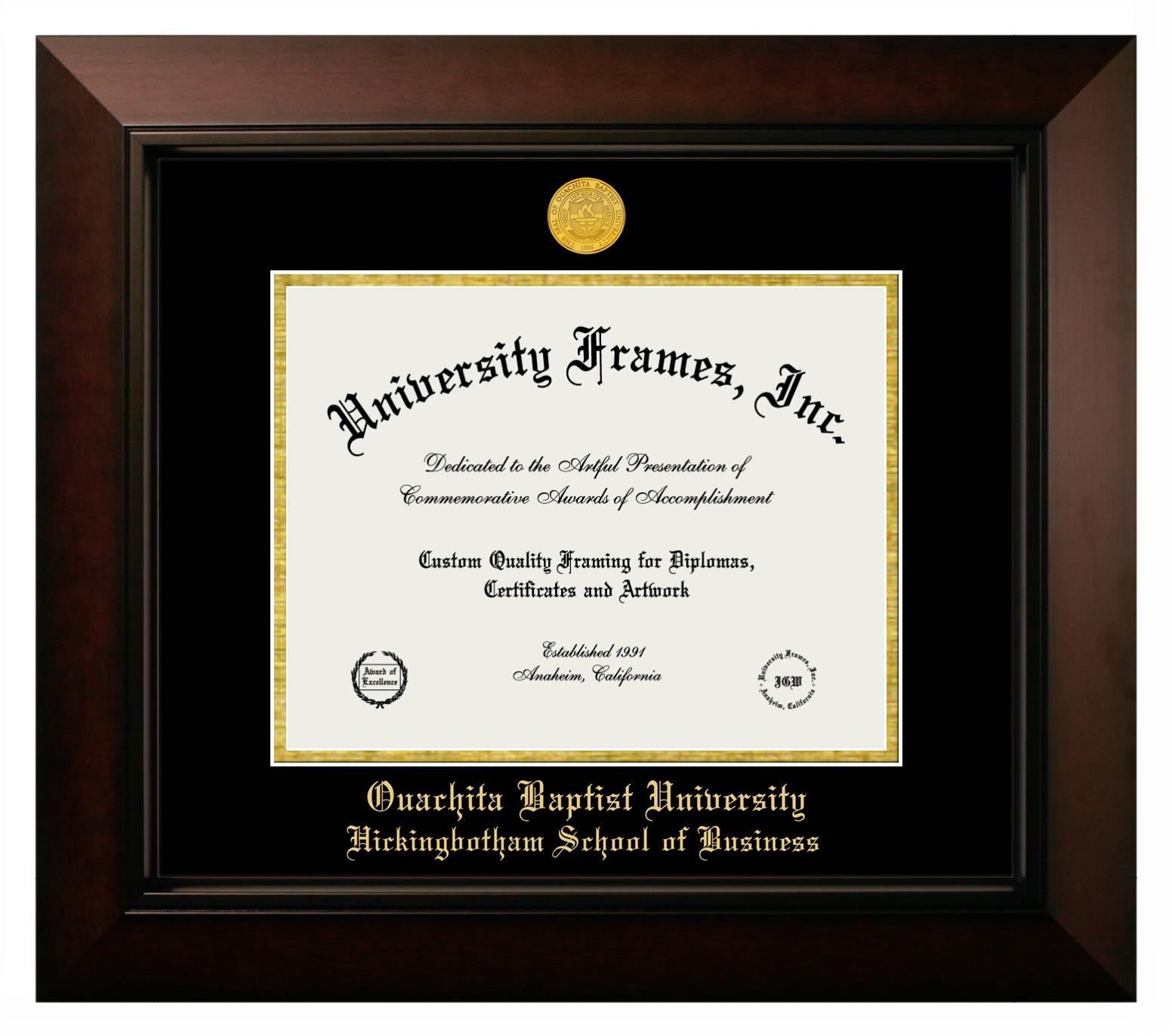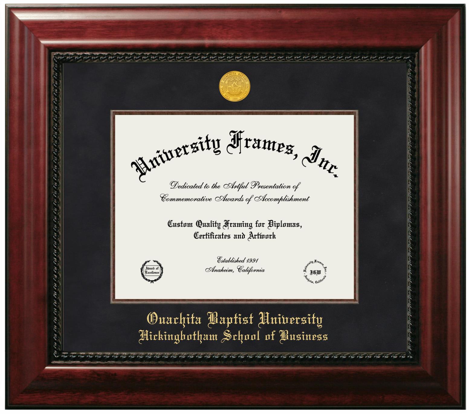 If you are looking for a professional diploma frame to showcase your achievement or are in search of a unique graduation gift for a recent grad or alum, you have come to the right place! We provide Ouachita Baptist University Hickingbotham School of Business diploma frames that are handcrafted in the USA and sized to fit the official Ouachita Baptist University Hickingbotham School of Business diploma. You can customize the graduation frames according to your taste with our online design tool. Go ahead and start customizing your diploma frame now!