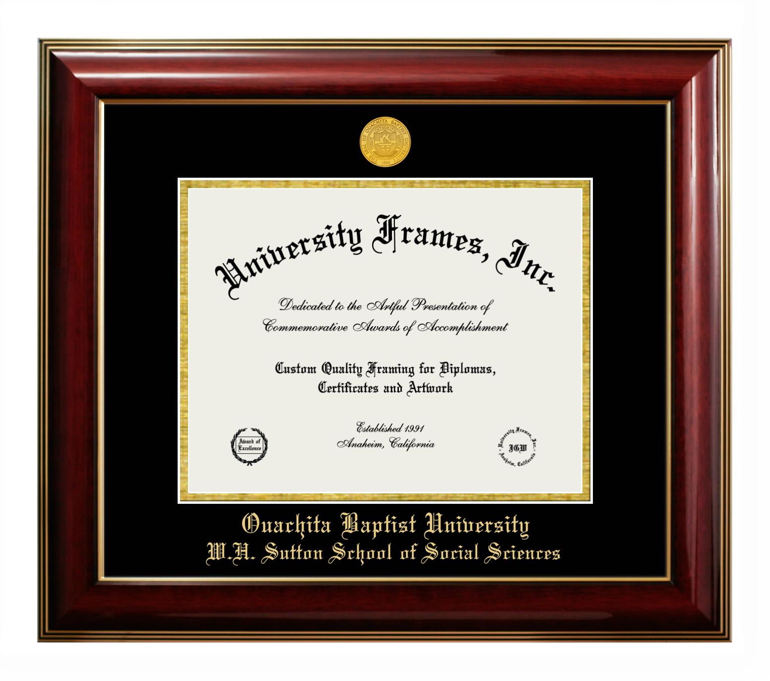 If you are looking for a professional diploma frame to showcase your achievement or are in search of a unique graduation gift for a recent grad or alum, you have come to the right place! We provide Ouachita Baptist University W.H. Sutton School of Social Sciences diploma frames that are handcrafted in the USA and sized to fit the official Ouachita Baptist University W.H. Sutton School of Social Sciences diploma. You can customize the graduation frames according to your taste with our online design tool. Go ahead and start customizing your diploma frame now!