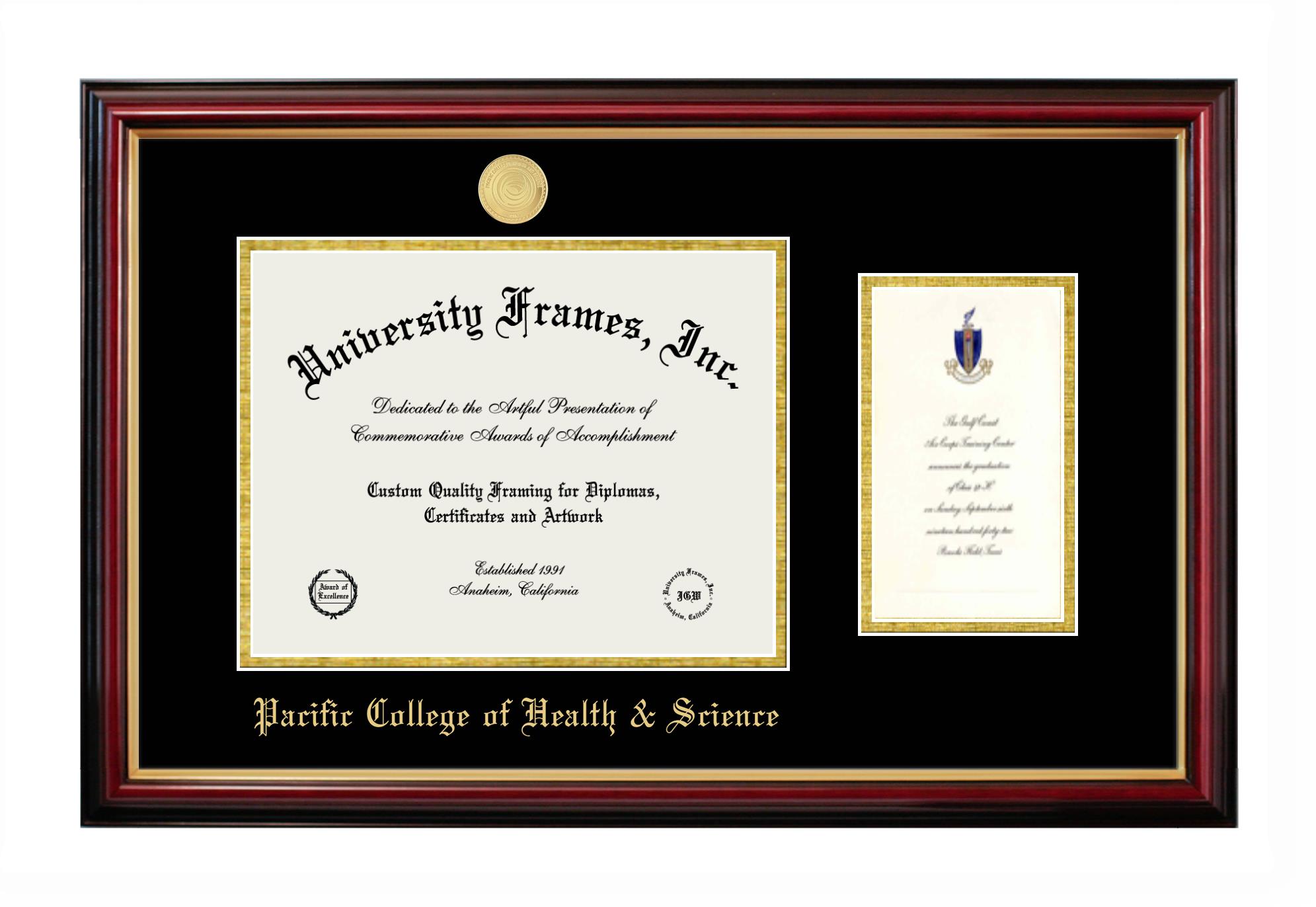 Hey there, Pacific College of Health & Science grads. Congratulations for your accomplishment! Since you’re here, you must be looking for a professional graduation frame to preserve and showcase your Pacific College of Health & Science diploma. Or, you may be looking for a diploma frame for another grad. We at University Frames, create the finest diploma frames and are licensed with Pacific College of Health & Science. Each of our degree frames is handcrafted in the US using the finest hardwood and with an exemplary level of attention to detail. Customize your diploma frame using our easy and intuitive online design tool.