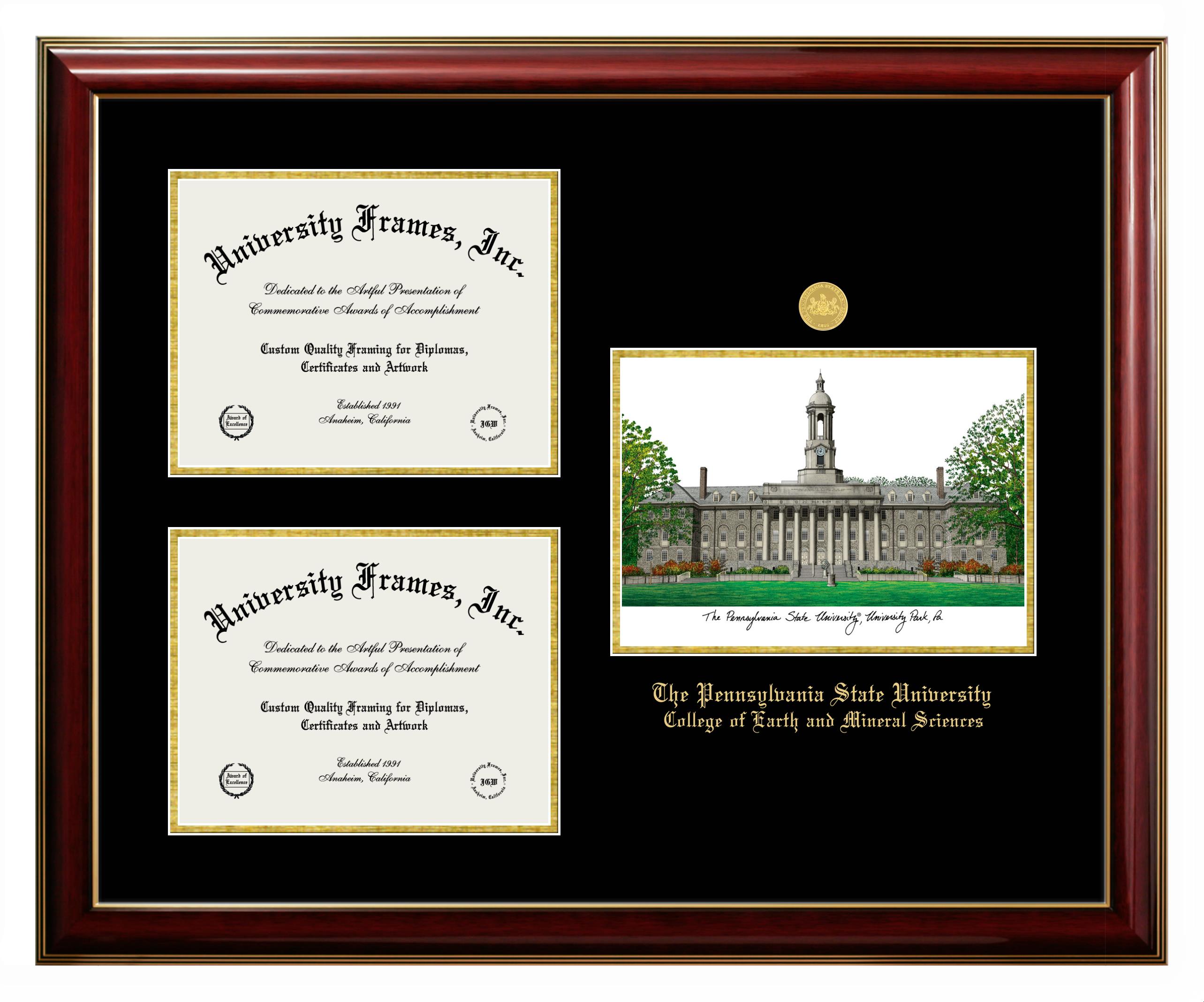 If you are looking for a professional diploma frame to showcase your achievement or are in search of a unique graduation gift for a recent grad or alum, you have come to the right place! We provide Pennsylvania State University College of Earth and Mineral Sciences diploma frames that are handcrafted in the USA and sized to fit the official Pennsylvania State University College of Earth and Mineral Sciences diploma. You can customize the graduation frames according to your taste with our online design tool. Go ahead and start customizing your diploma frame now!
