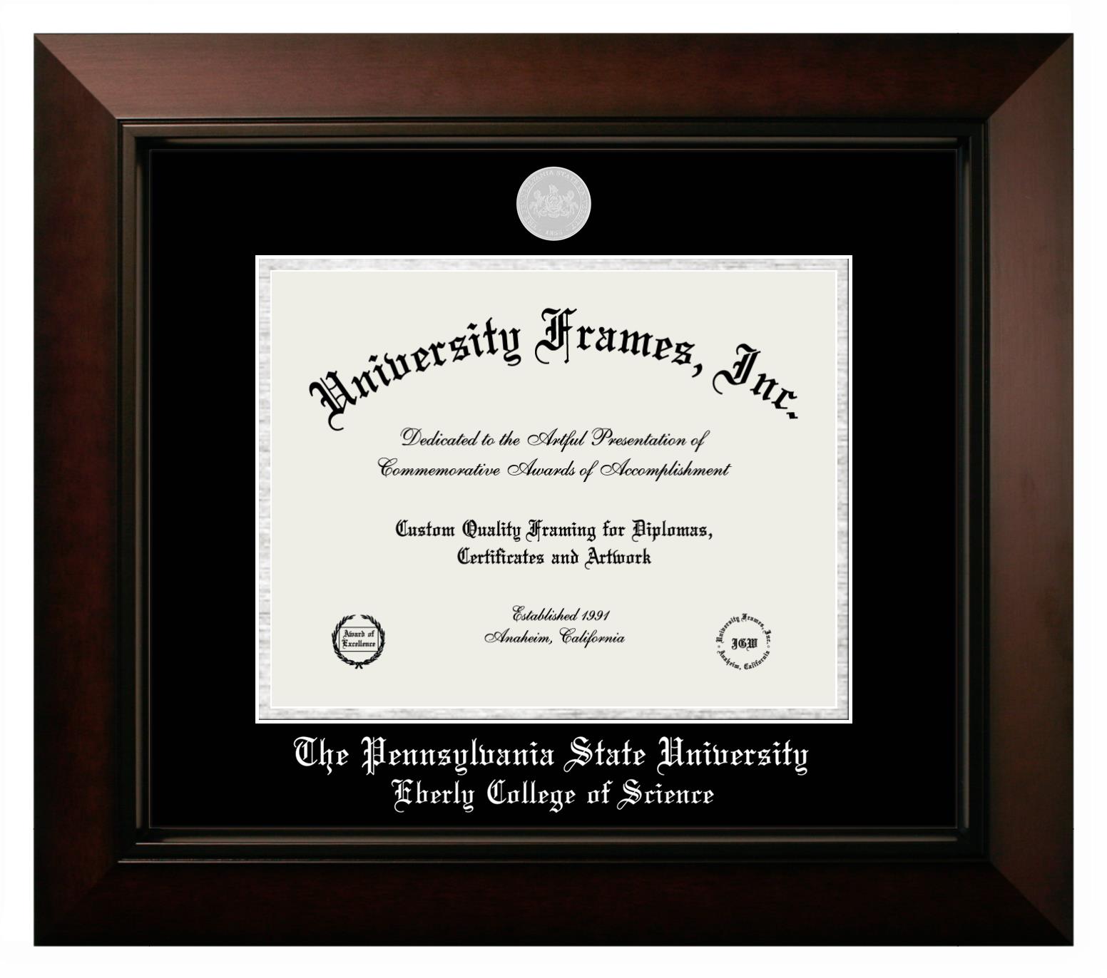 If you are looking for a professional diploma frame to showcase your achievement or are in search of a unique graduation gift for a recent grad or alum, you have come to the right place! We provide Pennsylvania State University Eberly College of Science diploma frames that are handcrafted in the USA and sized to fit the official Pennsylvania State University Eberly College of Science diploma. You can customize the graduation frames according to your taste with our online design tool. Go ahead and start customizing your diploma frame now!
