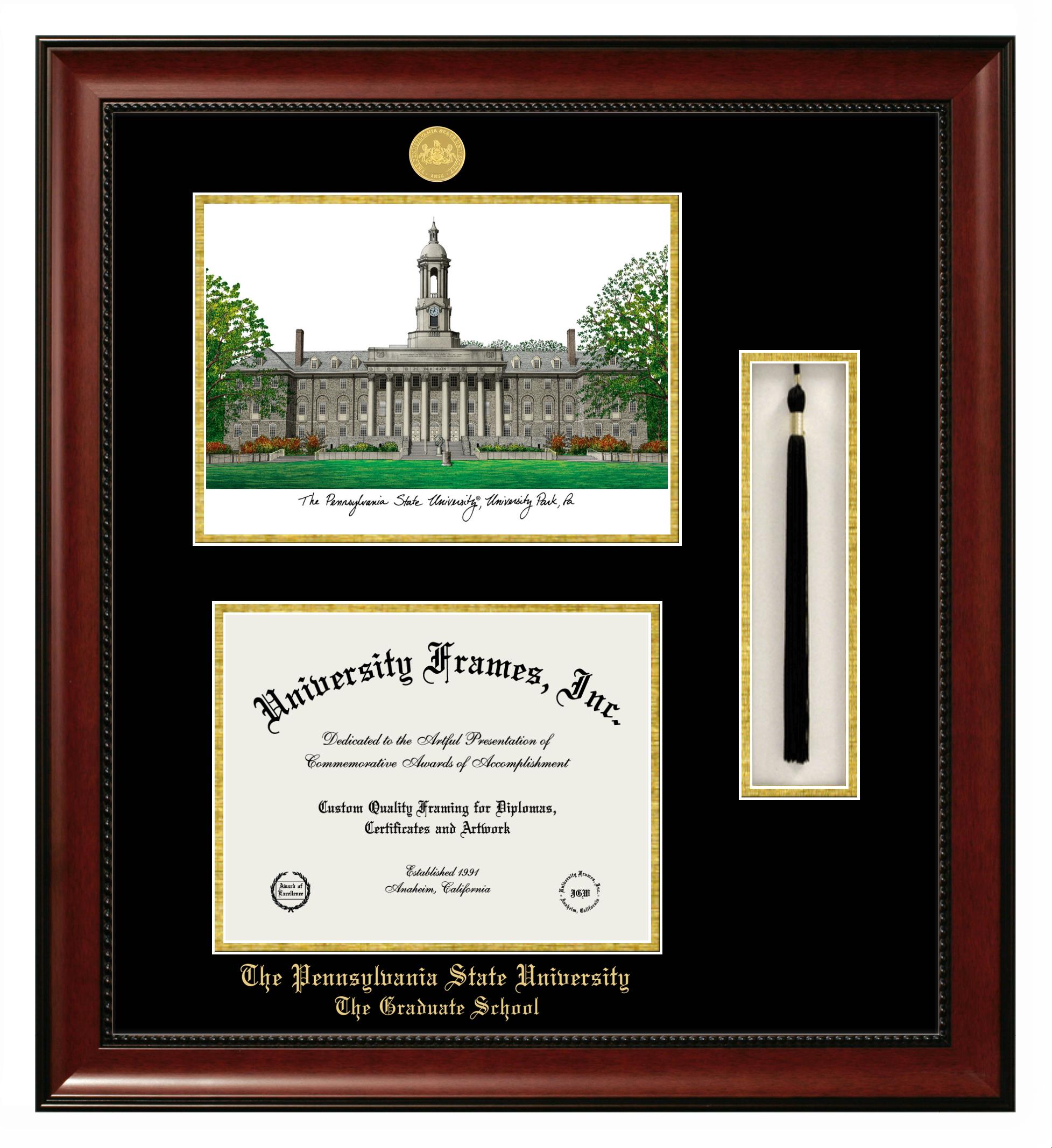 If you are looking for a professional diploma frame to showcase your achievement or are in search of a unique graduation gift for a recent grad or alum, you have come to the right place! We provide Pennsylvania State University The Graduate School diploma frames that are handcrafted in the USA and sized to fit the official Pennsylvania State University The Graduate School diploma. You can customize the graduation frames according to your taste with our online design tool. Go ahead and start customizing your diploma frame now!