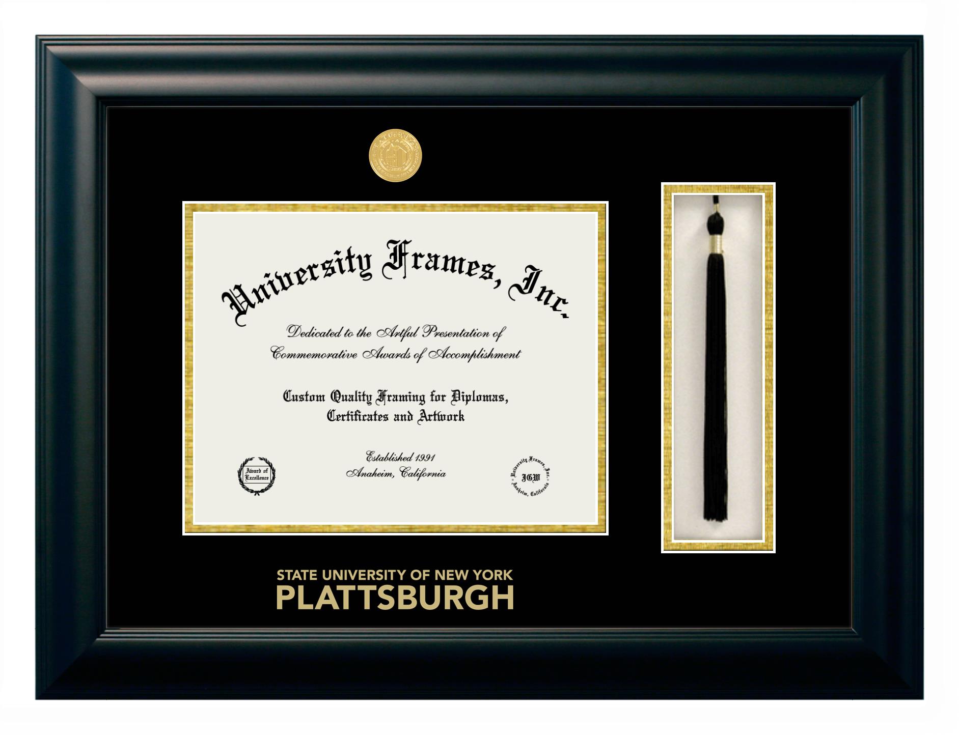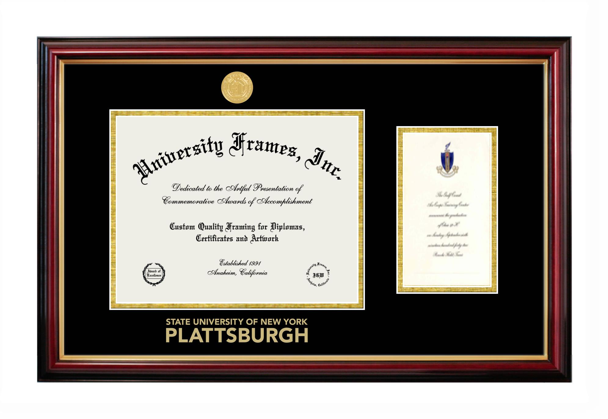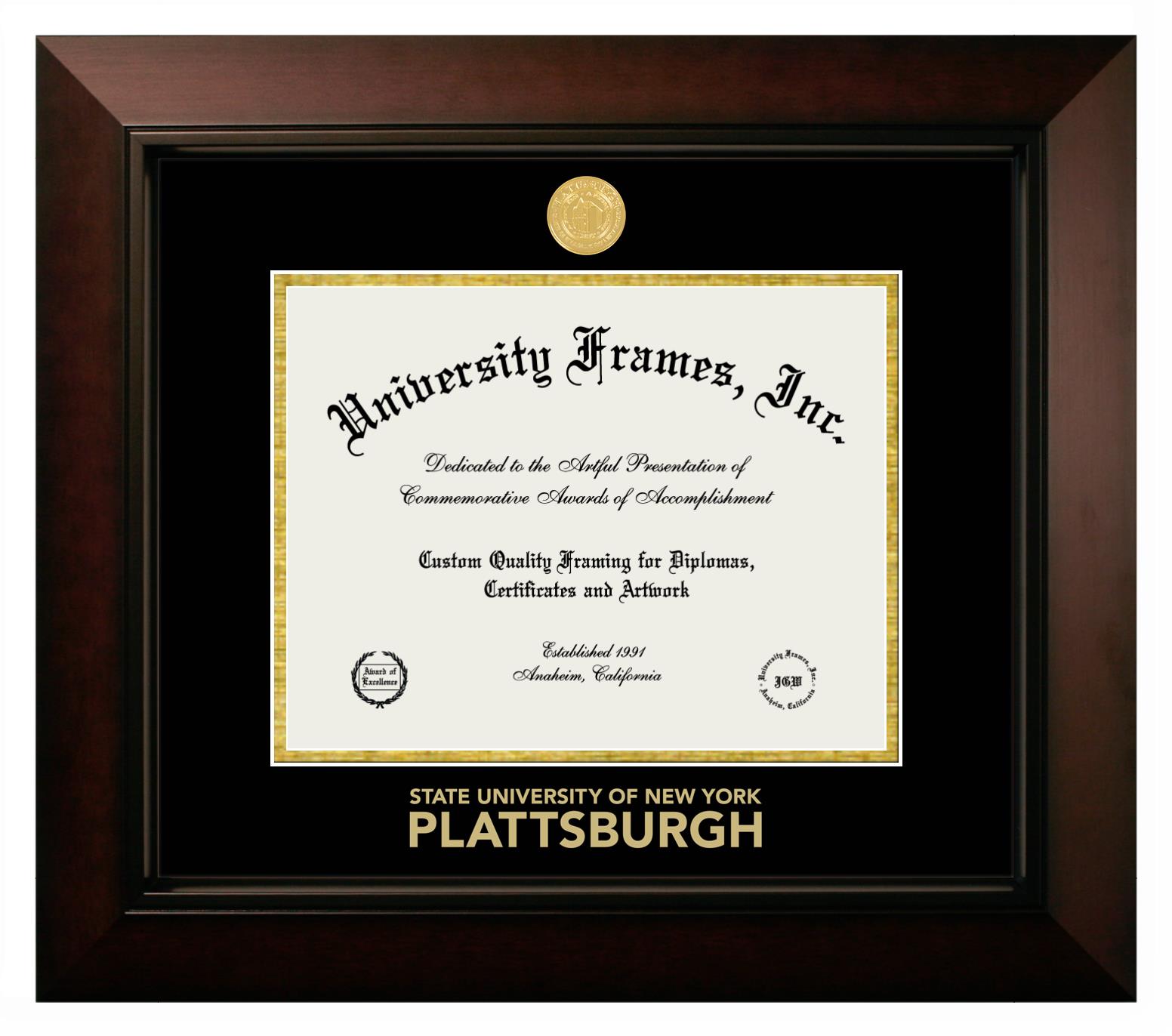 If you are looking for a professional diploma frame to showcase your achievement or are in search of a unique graduation gift for a recent grad or alum, you have come to the right place! We provide Plattsburgh State University (SUNY Plattsburgh) diploma frames that are handcrafted in the USA and sized to fit the official Plattsburgh State University (SUNY Plattsburgh) diploma. You can customize the graduation frames according to your taste with our online design tool. Go ahead and start customizing your diploma frame now!