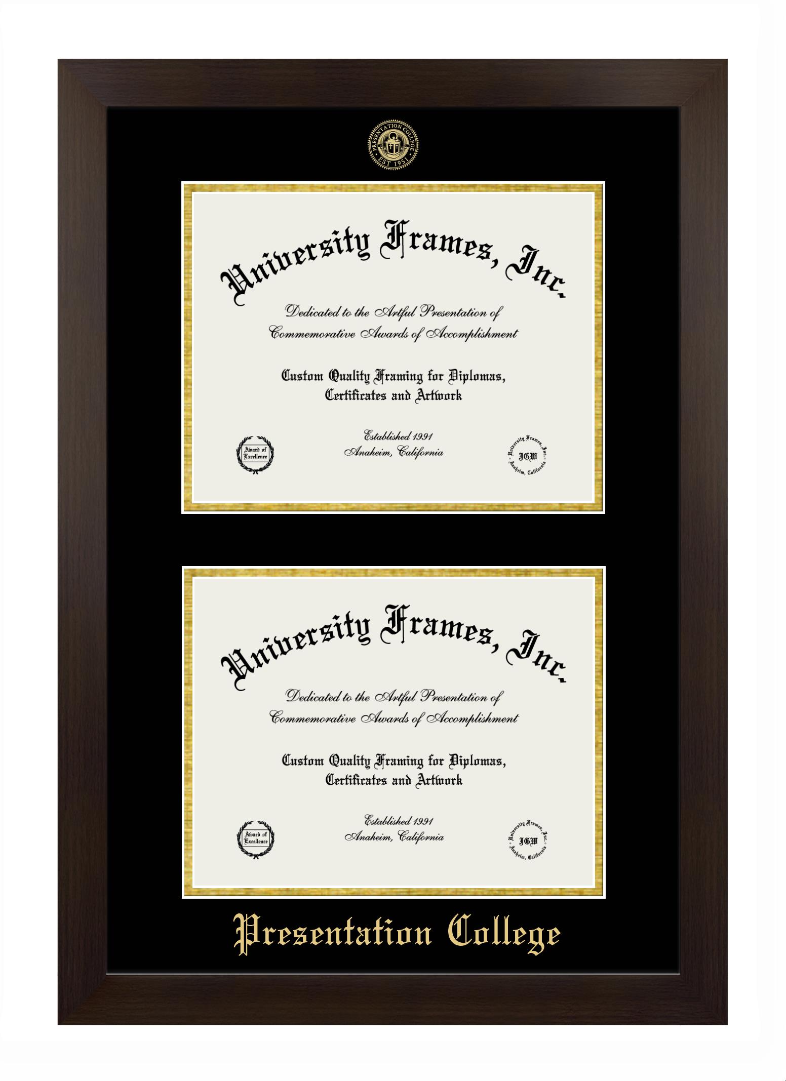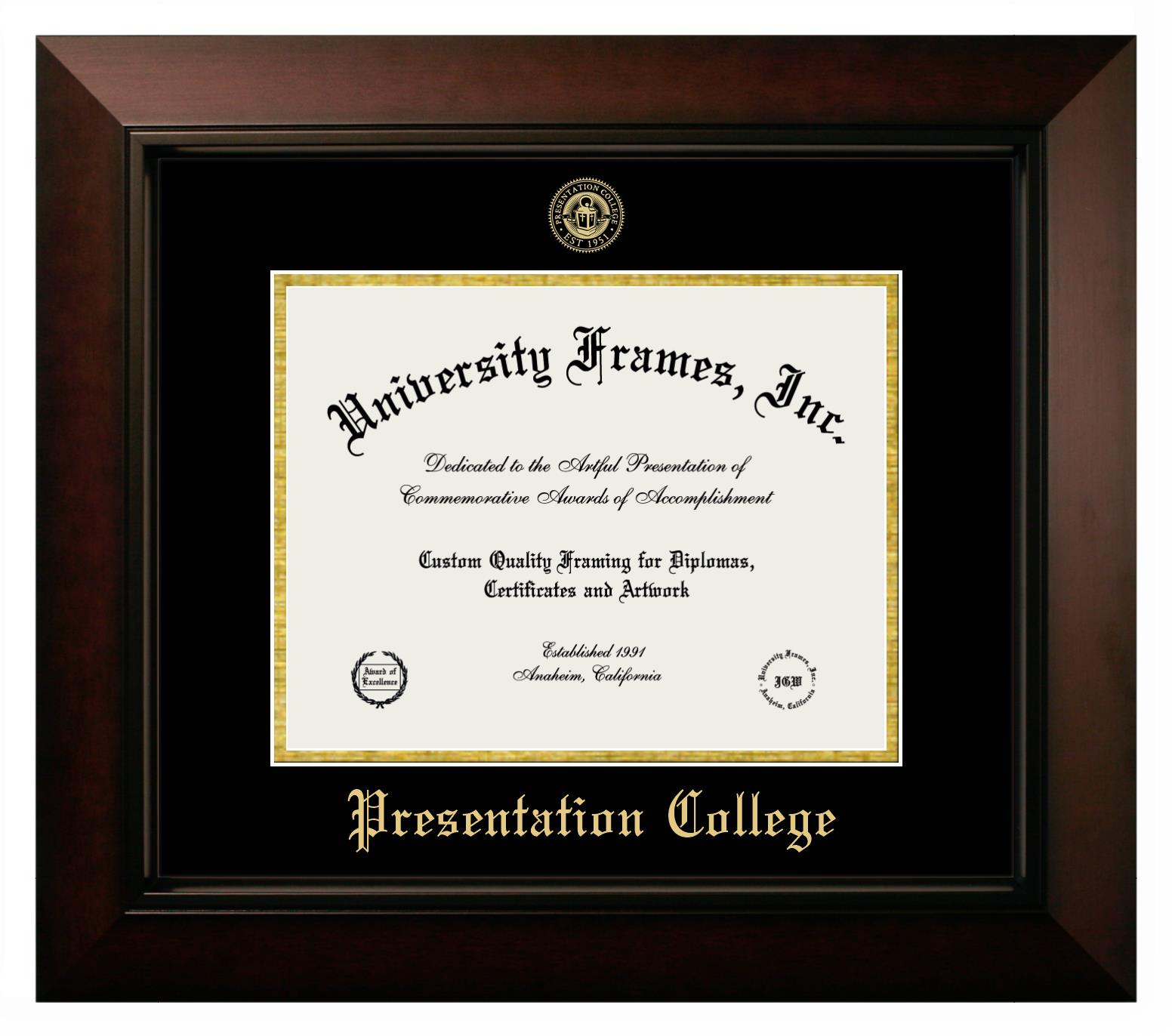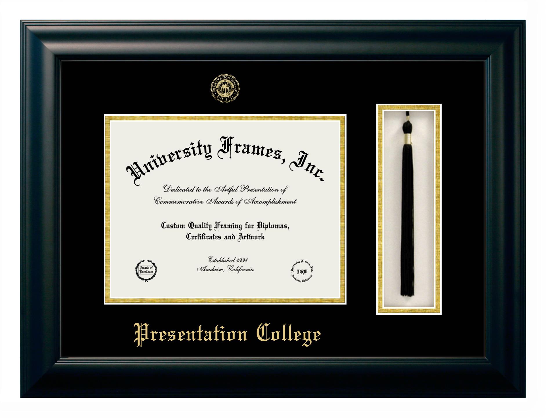 If you are looking for a professional diploma frame to showcase your achievement or are in search of a unique graduation gift for a recent grad or alum, you have come to the right place! We provide Presentation College diploma frames that are handcrafted in the USA and sized to fit the official Presentation College diploma. You can customize the graduation frames according to your taste with our online design tool. Go ahead and start customizing your diploma frame now!