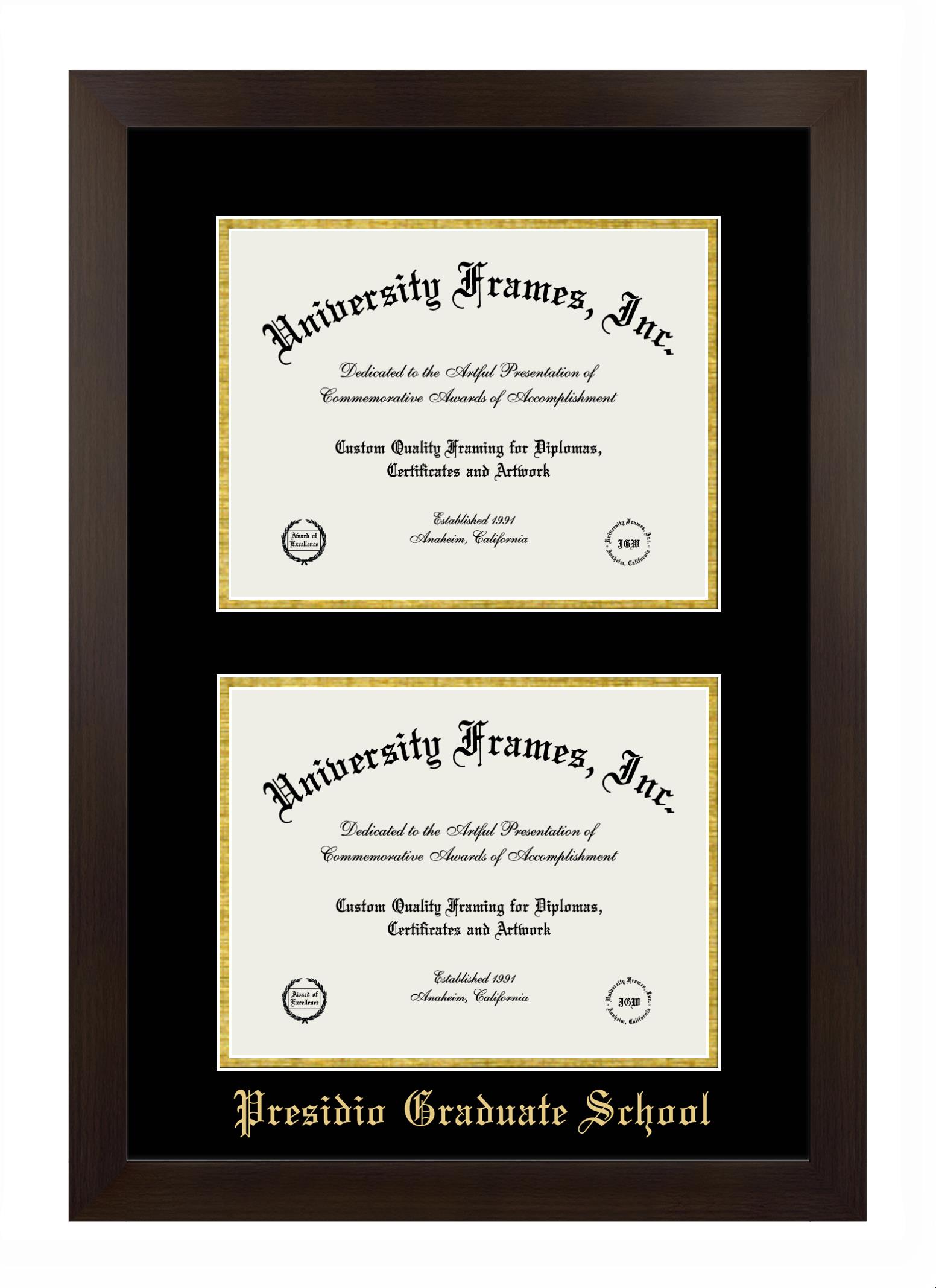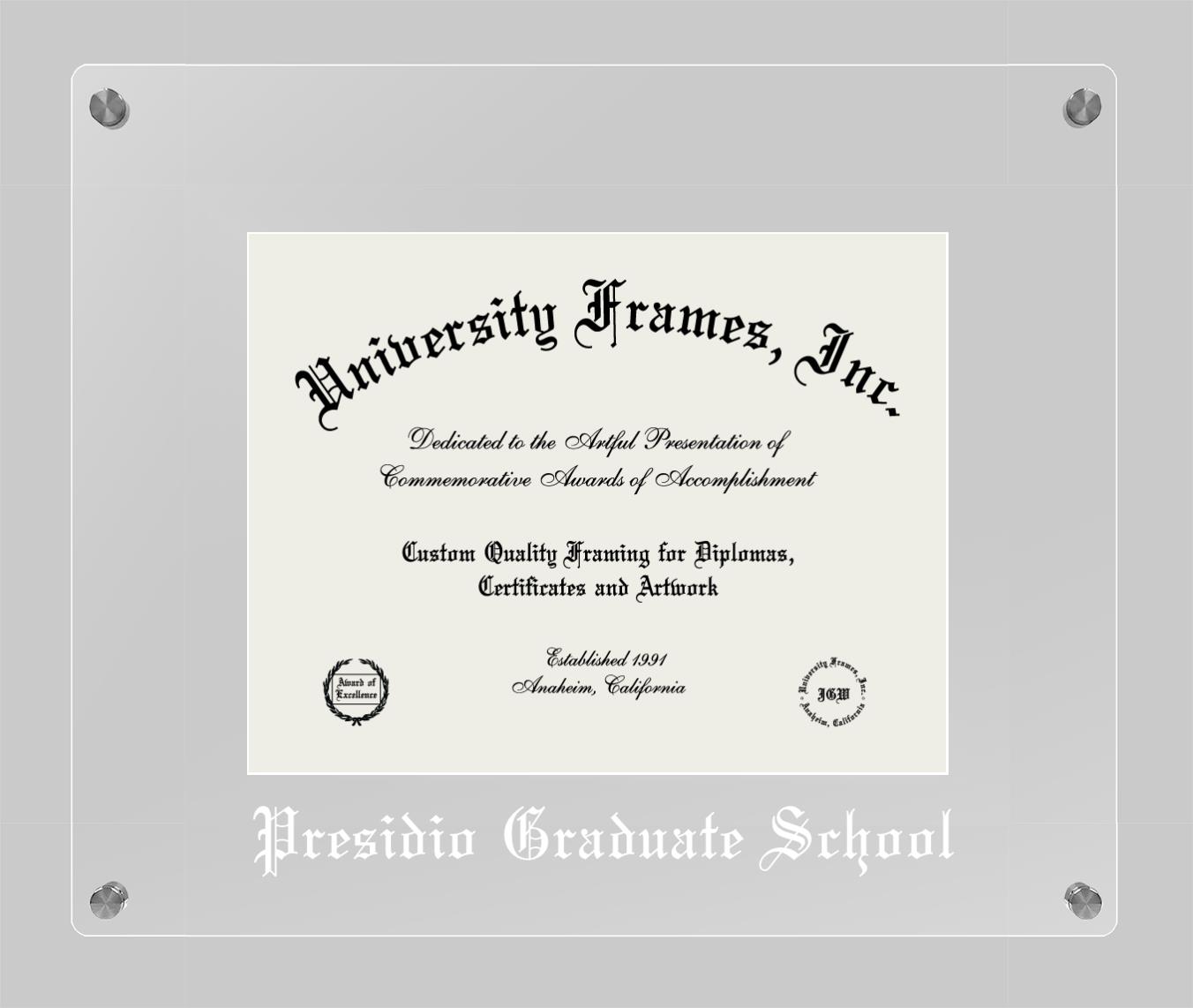 If you are looking for a professional diploma frame to showcase your achievement or are in search of a unique graduation gift for a recent grad or alum, you have come to the right place! We provide Presidio Graduate School diploma frames that are handcrafted in the USA and sized to fit the official Presidio Graduate School diploma. You can customize the graduation frames according to your taste with our online design tool. Go ahead and start customizing your diploma frame now!
