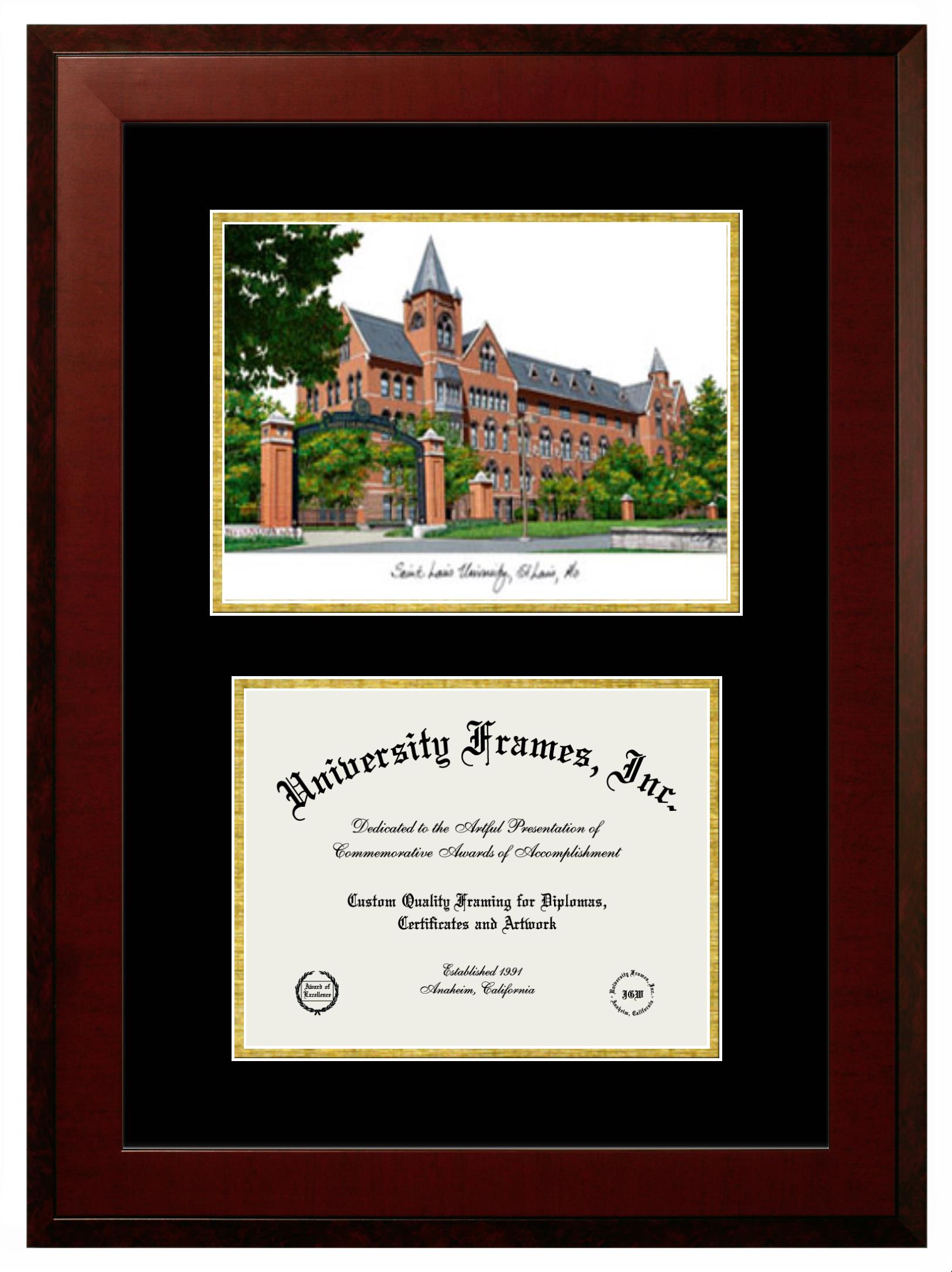 If you are looking for a professional diploma frame to showcase your achievement or are in search of a unique graduation gift for a recent grad or alum, you have come to the right place! We provide Saint Louis University diploma frames that are handcrafted in the USA and sized to fit the official Saint Louis University diploma. You can customize the graduation frames according to your taste with our online design tool. Go ahead and start customizing your diploma frame now!
