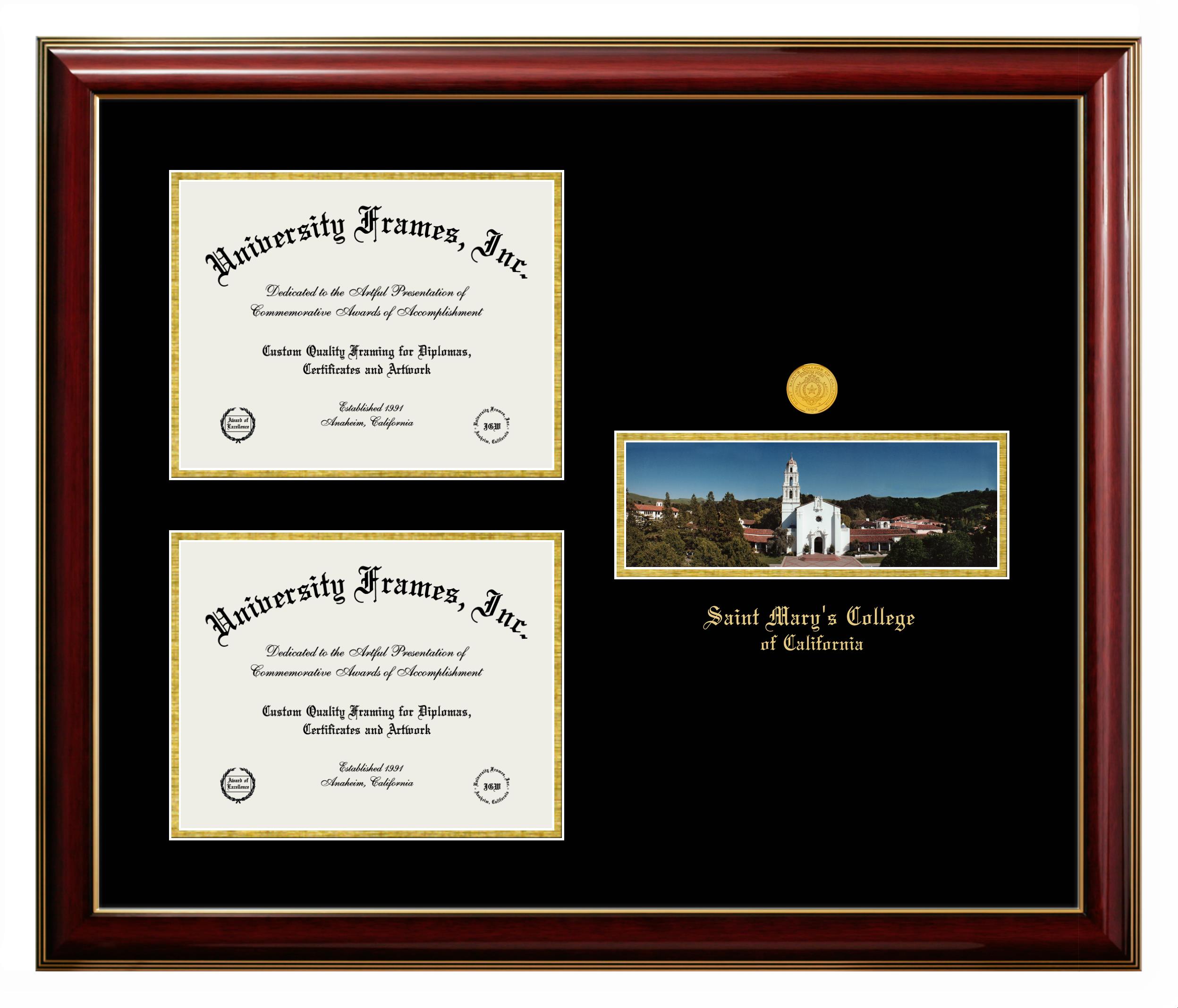 If you are looking for a professional diploma frame to showcase your achievement or are in search of a unique graduation gift for a recent grad or alum, you have come to the right place! We provide Saint Mary's College of California diploma frames that are handcrafted in the USA and sized to fit the official Saint Mary's College of California diploma. You can customize the graduation frames according to your taste with our online design tool. Go ahead and start customizing your diploma frame now!