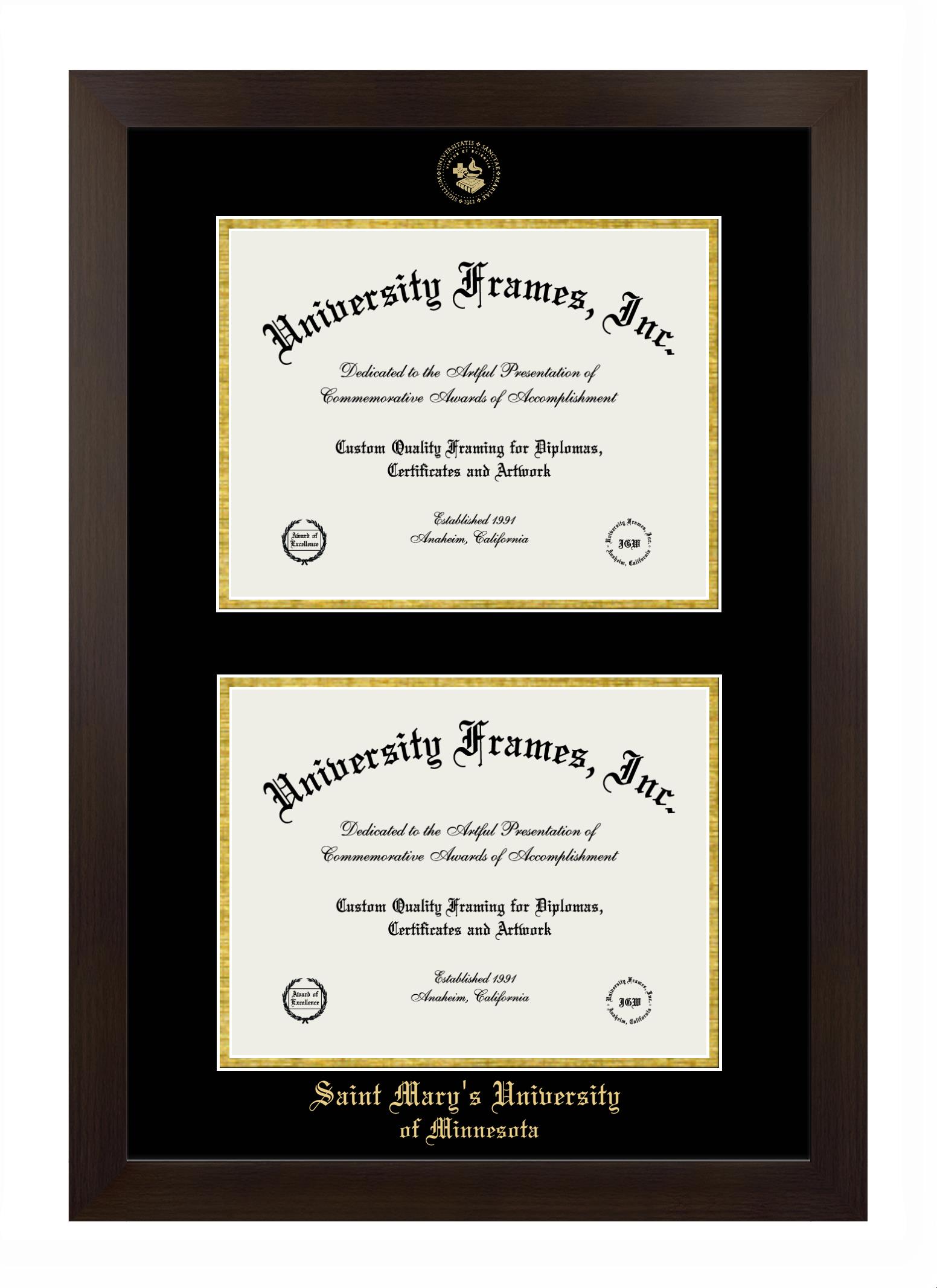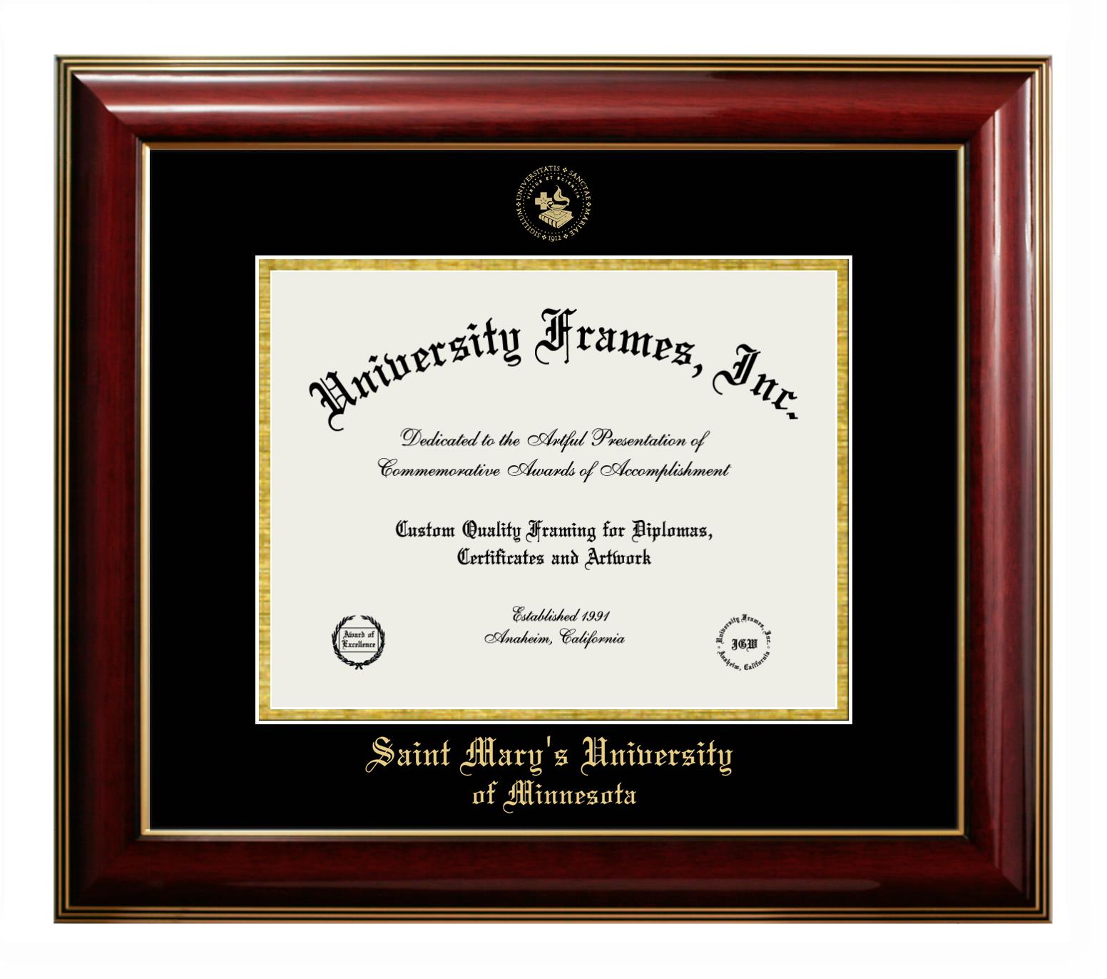 If you are looking for a professional diploma frame to showcase your achievement or are in search of a unique graduation gift for a recent grad or alum, you have come to the right place! We provide Saint Mary's University of Minnesota diploma frames that are handcrafted in the USA and sized to fit the official Saint Mary's University of Minnesota diploma. You can customize the graduation frames according to your taste with our online design tool. Go ahead and start customizing your diploma frame now!