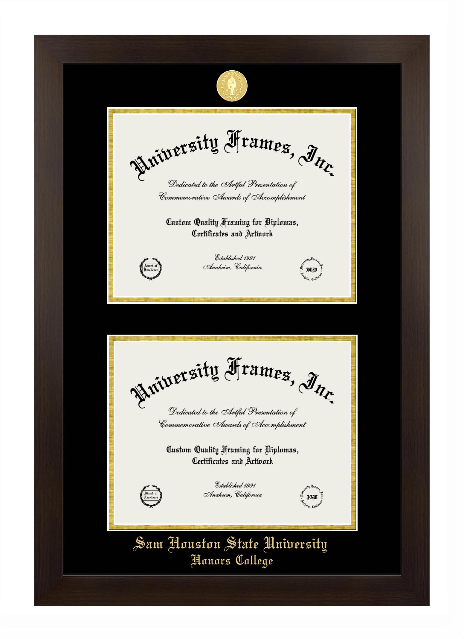 If you are looking for a professional diploma frame to showcase your achievement or are in search of a unique graduation gift for a recent grad or alum, you have come to the right place! We provide Sam Houston State University Honors College diploma frames that are handcrafted in the USA and sized to fit the official Sam Houston State University Honors College diploma. You can customize the graduation frames according to your taste with our online design tool. Go ahead and start customizing your diploma frame now!