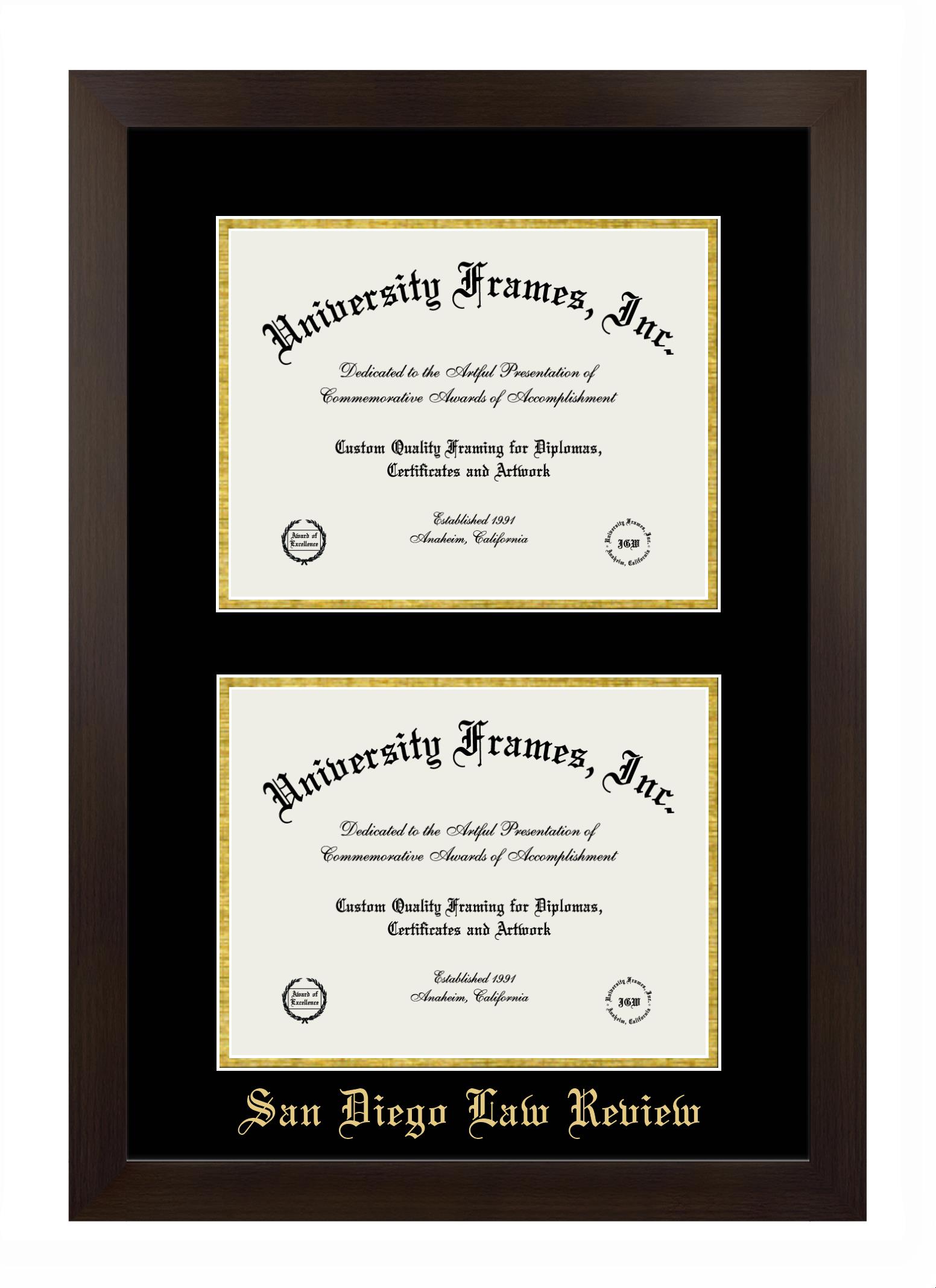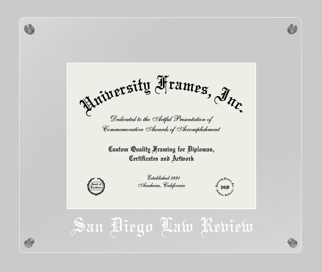 If you are looking for a professional diploma frame to showcase your achievement or are in search of a unique graduation gift for a recent grad or alum, you have come to the right place! We provide San Diego Law Review diploma frames that are handcrafted in the USA and sized to fit the official San Diego Law Review diploma. You can customize the graduation frames according to your taste with our online design tool. Go ahead and start customizing your diploma frame now!