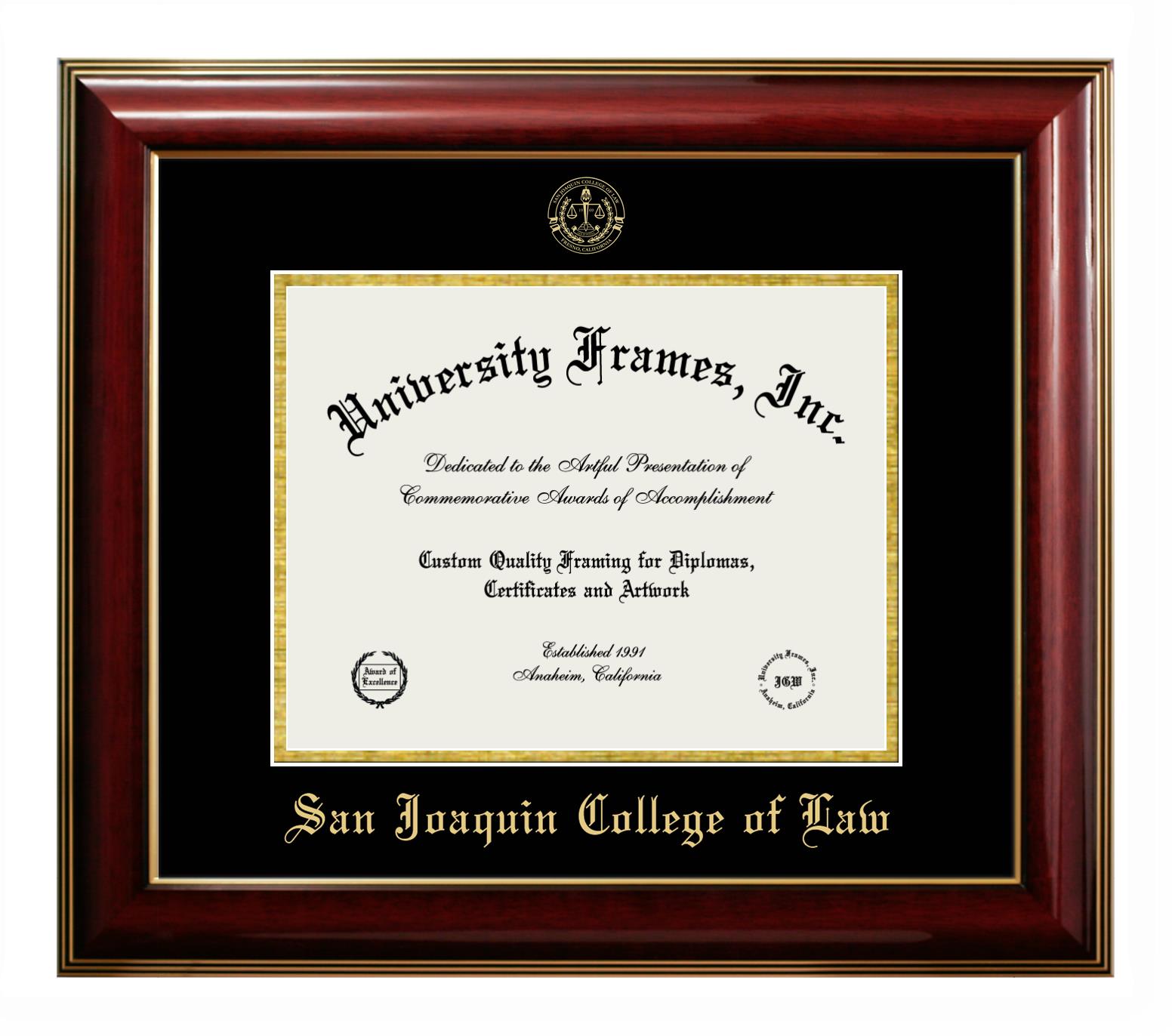 If you are looking for a professional diploma frame to showcase your achievement or are in search of a unique graduation gift for a recent grad or alum, you have come to the right place! We provide San Joaquin College of Law diploma frames that are handcrafted in the USA and sized to fit the official San Joaquin College of Law diploma. You can customize the graduation frames according to your taste with our online design tool. Go ahead and start customizing your diploma frame now!
