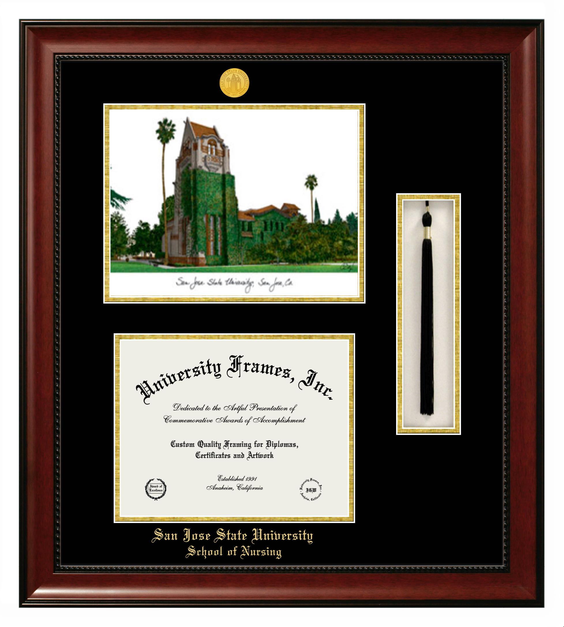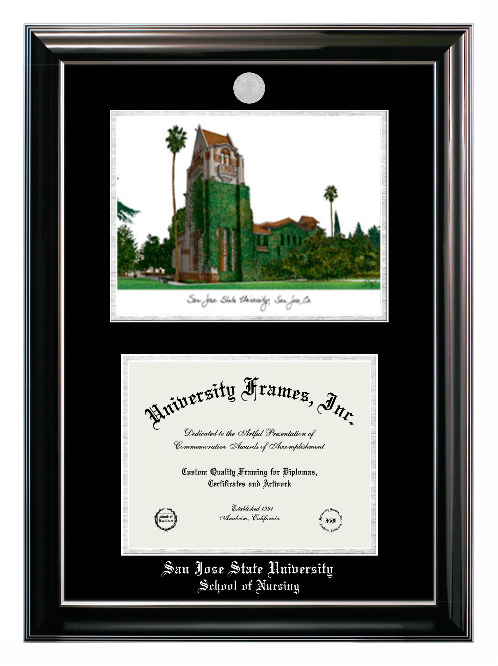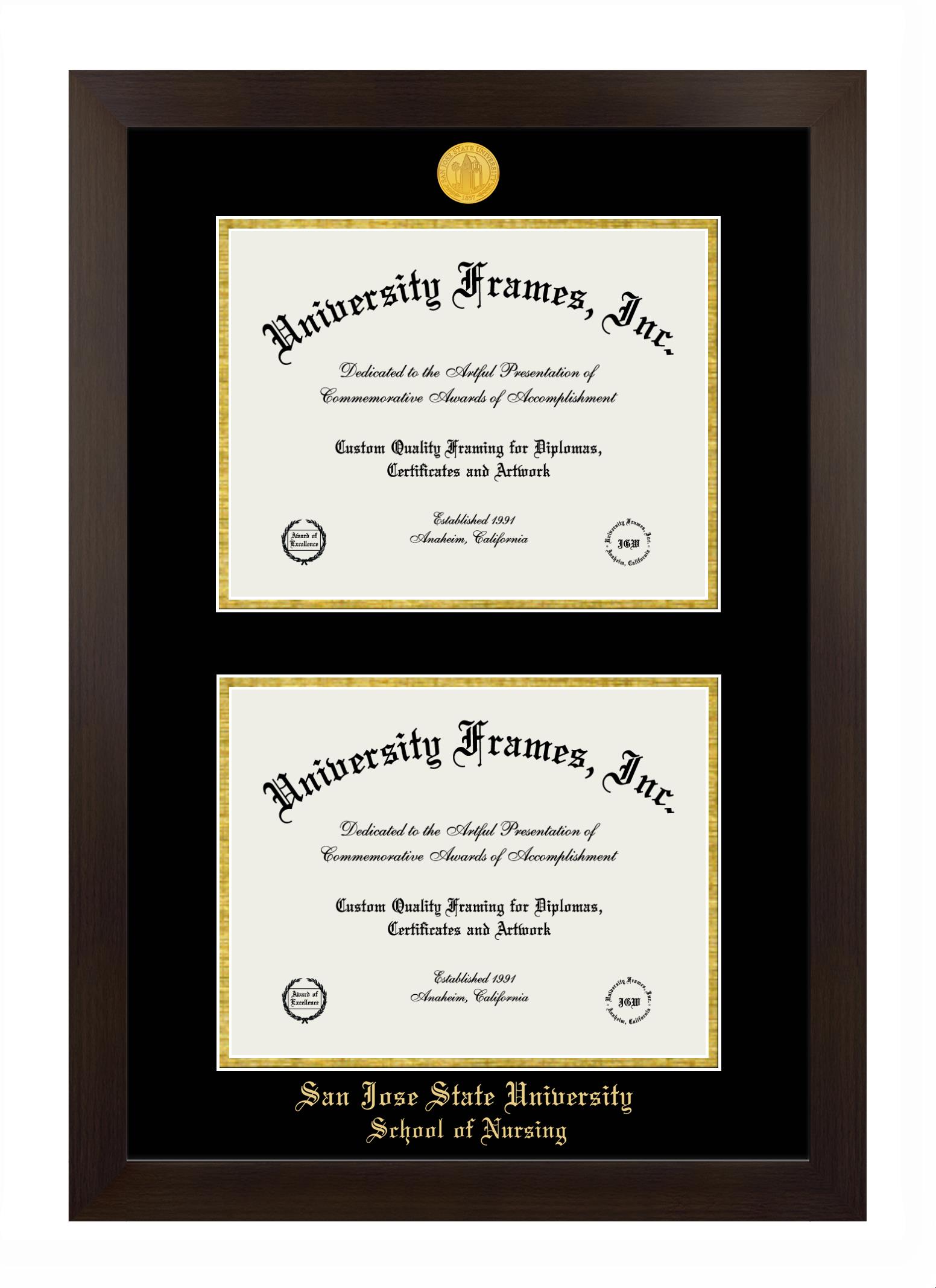 If you are looking for a professional diploma frame to showcase your achievement or are in search of a unique graduation gift for a recent grad or alum, you have come to the right place! We provide San Jose State University School of Nursing diploma frames that are handcrafted in the USA and sized to fit the official San Jose State University School of Nursing diploma. You can customize the graduation frames according to your taste with our online design tool. Go ahead and start customizing your diploma frame now!
