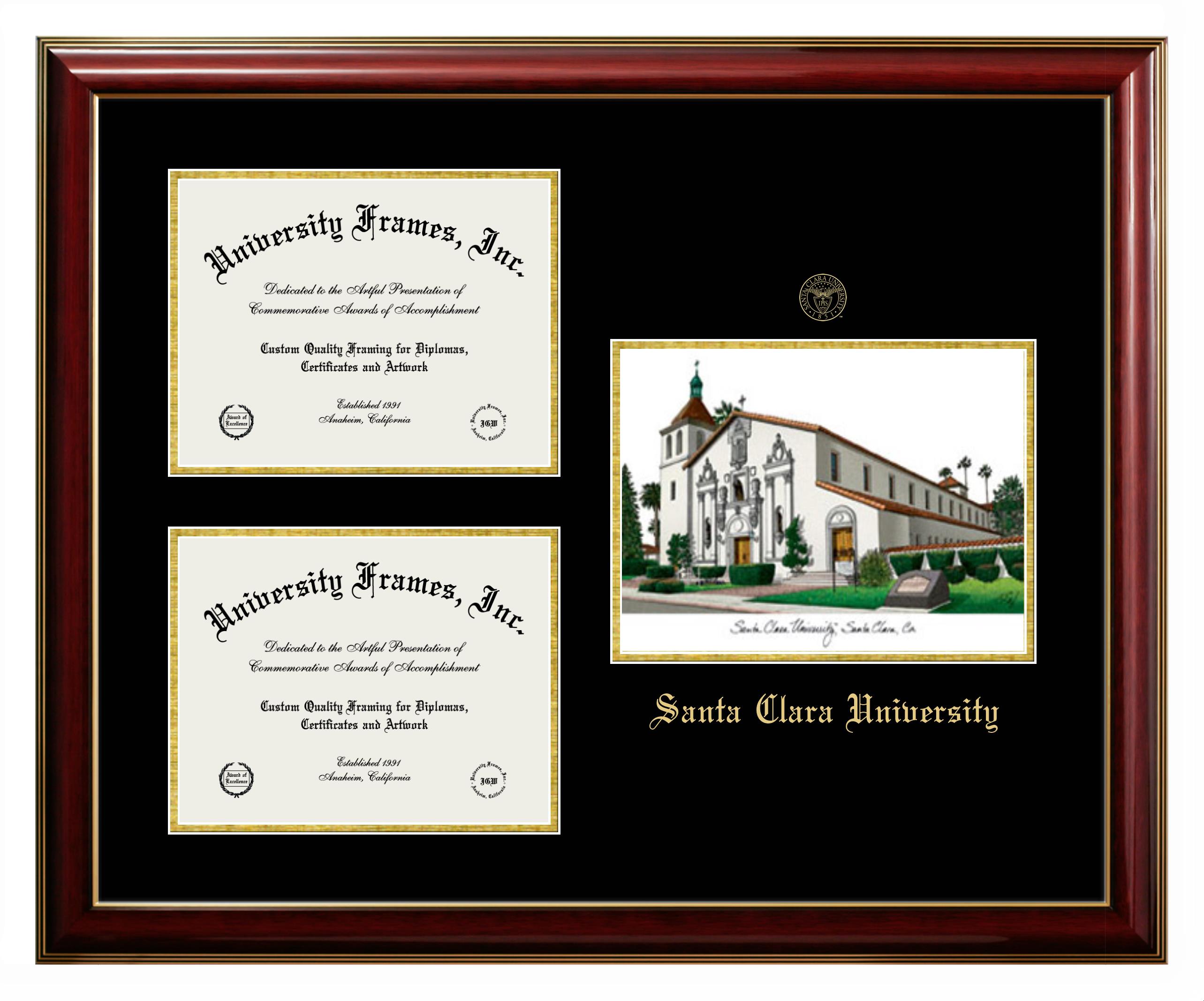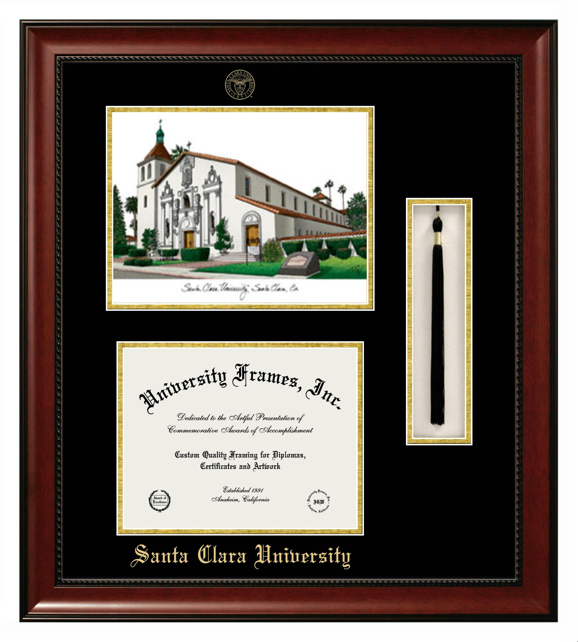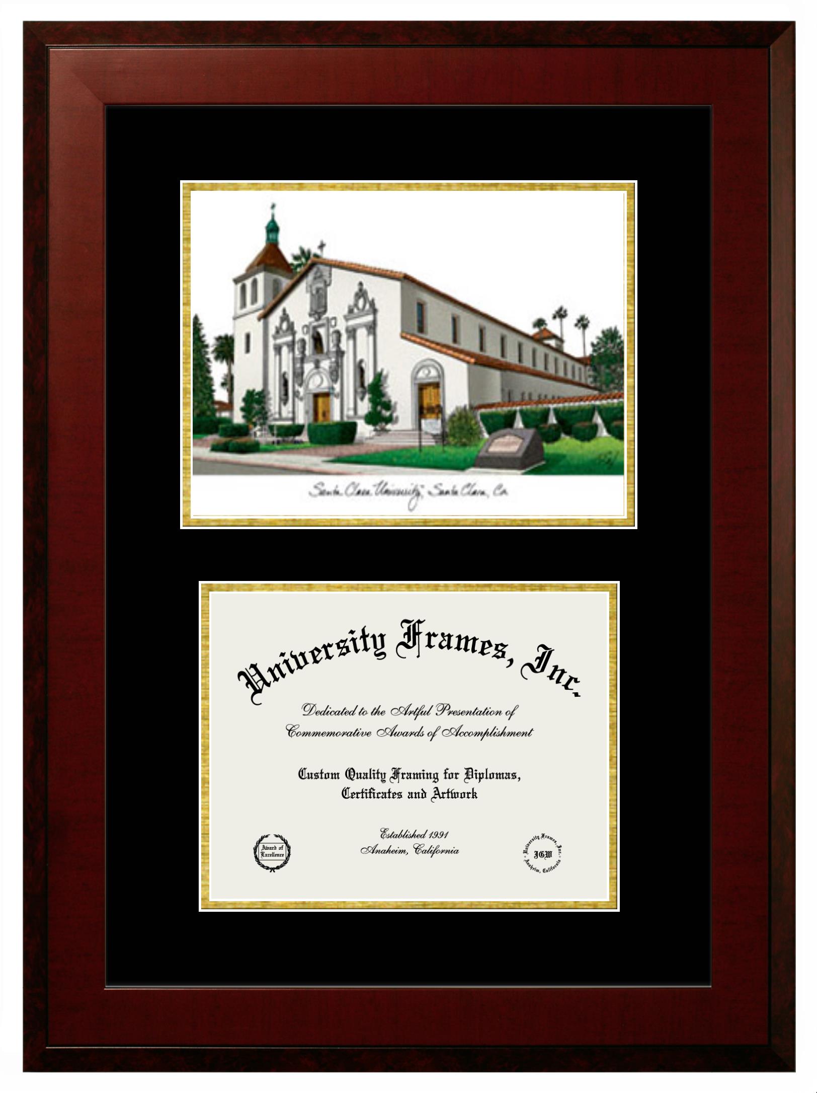 If you are looking for a professional diploma frame to showcase your achievement or are in search of a unique graduation gift for a recent grad or alum, you have come to the right place! We provide Santa Clara University diploma frames that are handcrafted in the USA and sized to fit the official Santa Clara University diploma. You can customize the graduation frames according to your taste with our online design tool. Go ahead and start customizing your diploma frame now!