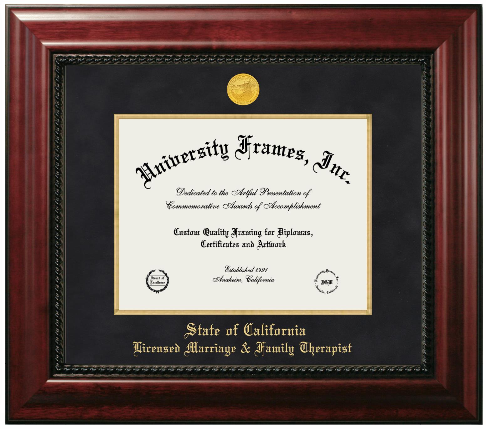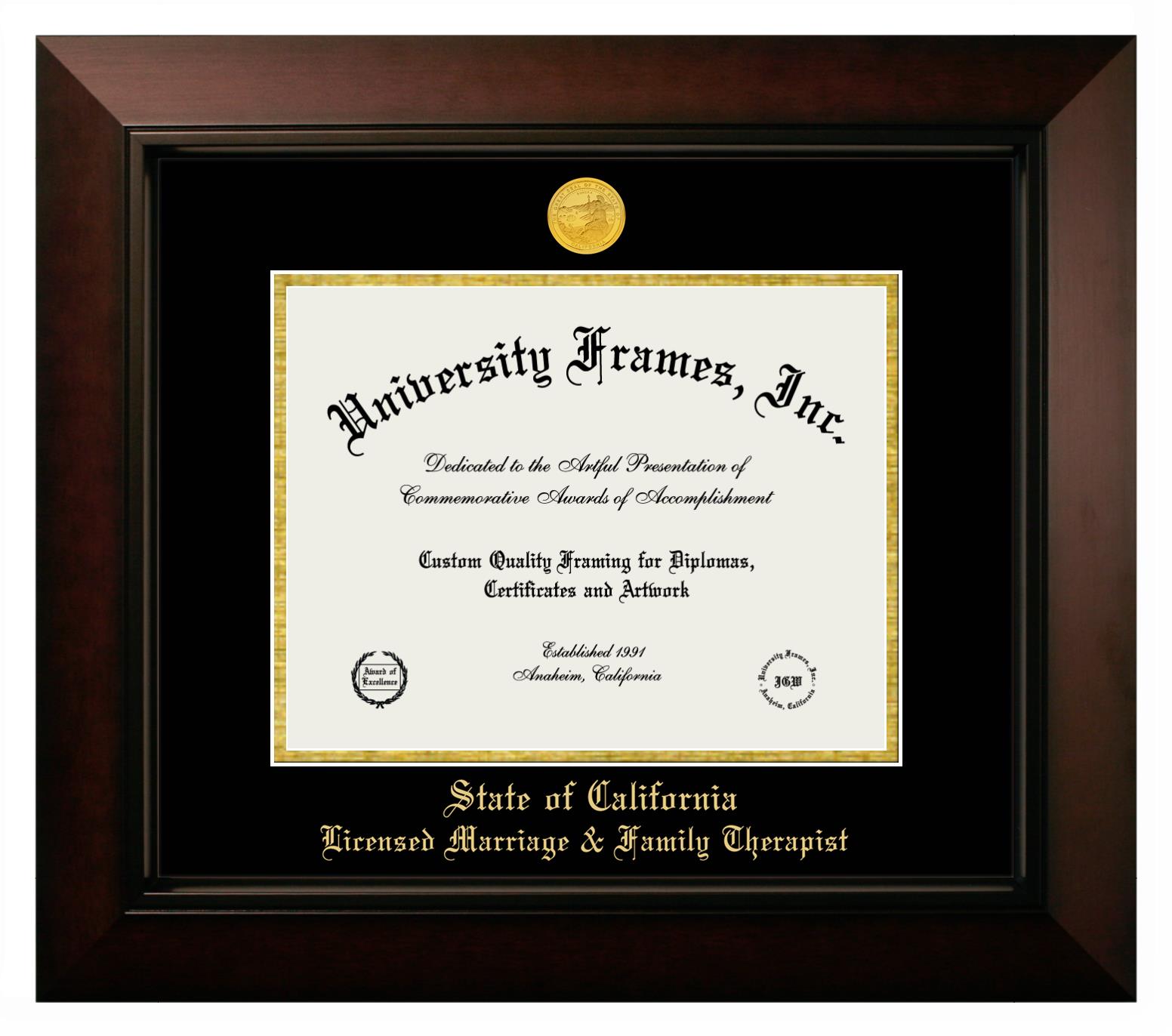 Want a professional diploma frame to showcase your achievement? Or are you looking for a fantastic graduation gift for a new grad or alum? Our official State of California Licensed Marriage & Family Therapist diploma frames are the best option to showcase any well-deserved diploma. Handcrafted in the USA, our best-in-class degree frames are custom-designed for the official State of California Licensed Marriage & Family Therapist diploma. You can customize your frame with our hassle-free online design tool. Start customizing your diploma frame now!