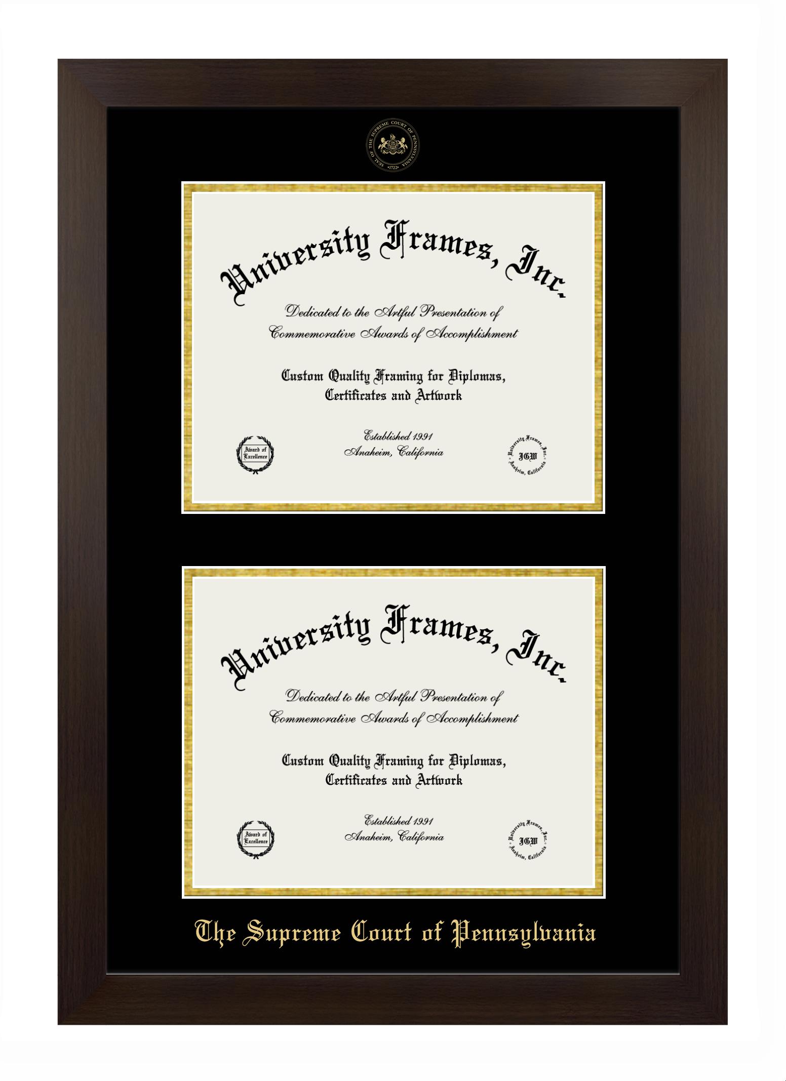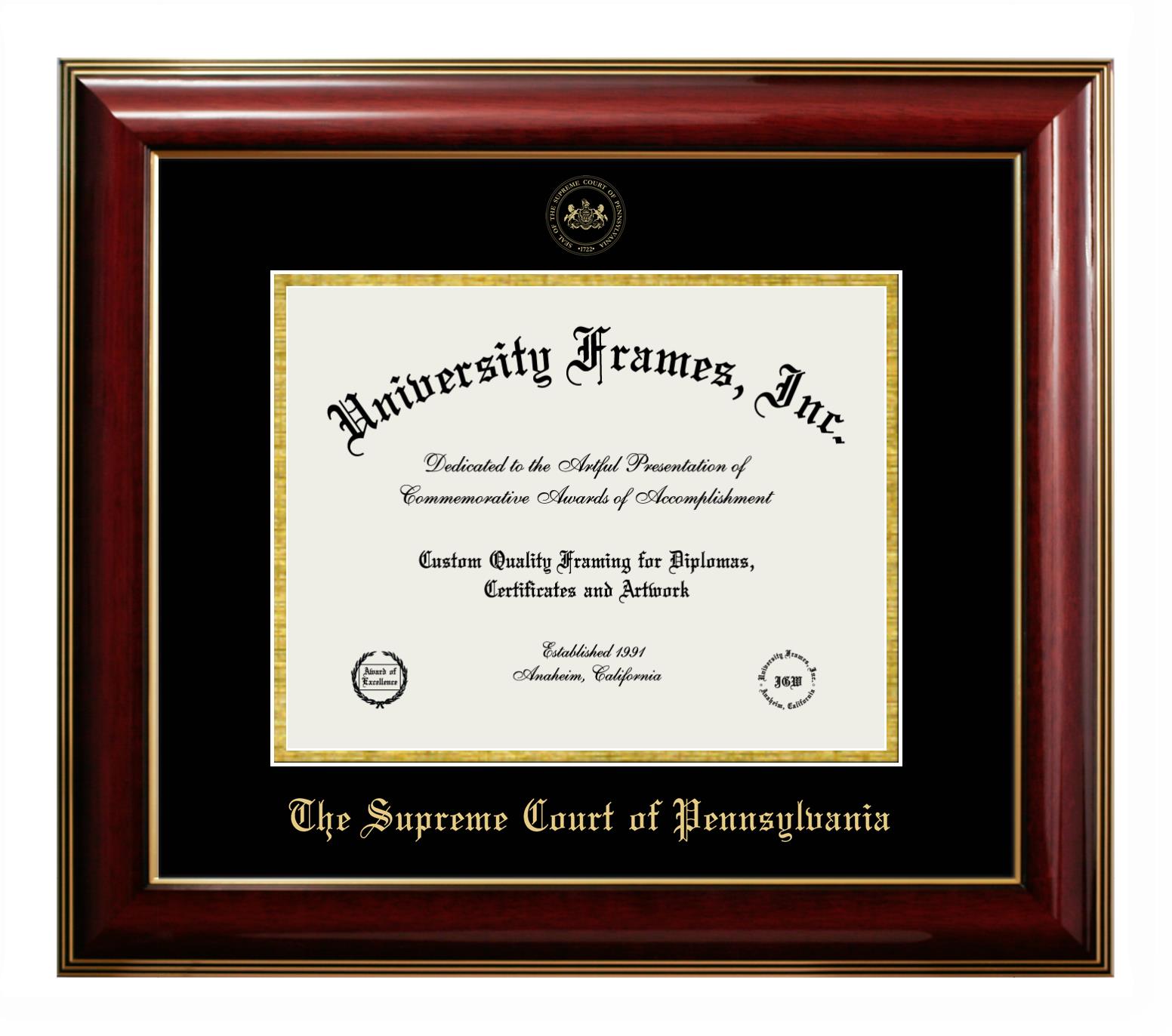 Want a professional diploma frame to showcase your achievement? Or are you looking for a fantastic graduation gift for a new grad or alum? Our official Supreme Court of Pennsylvania diploma frames are the best option to showcase any well-deserved diploma. Handcrafted in the USA, our best-in-class degree frames are custom-designed for the official Supreme Court of Pennsylvania diploma. You can customize your frame with our hassle-free online design tool. Start customizing your diploma frame now!