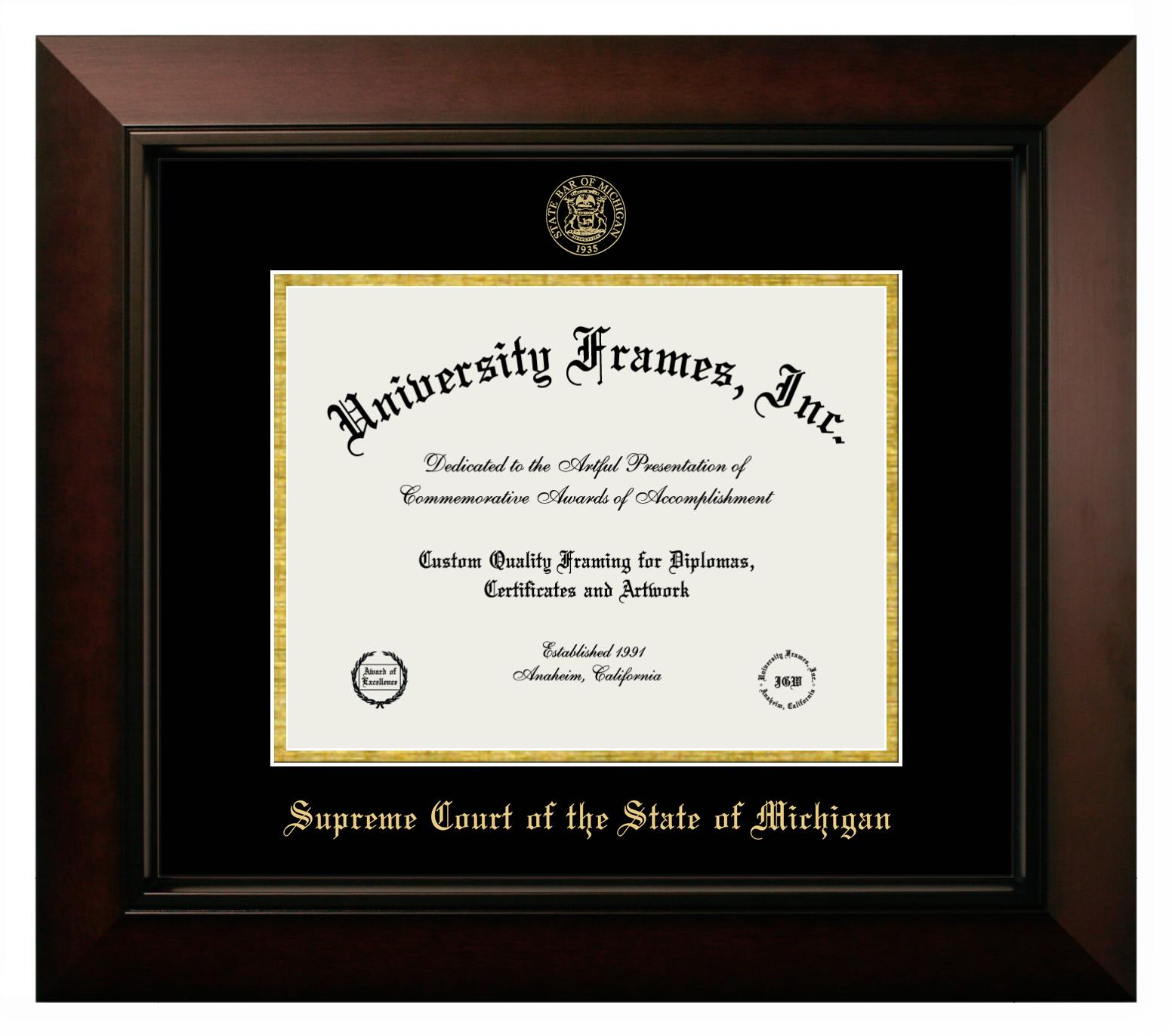 Want a professional diploma frame to showcase your achievement? Or are you looking for a fantastic graduation gift for a new grad or alum? Our official Supreme Court of the State of Michigan diploma frames are the best option to showcase any well-deserved diploma. Handcrafted in the USA, our best-in-class degree frames are custom-designed for the official Supreme Court of the State of Michigan diploma. You can customize your frame with our hassle-free online design tool. Start customizing your diploma frame now!