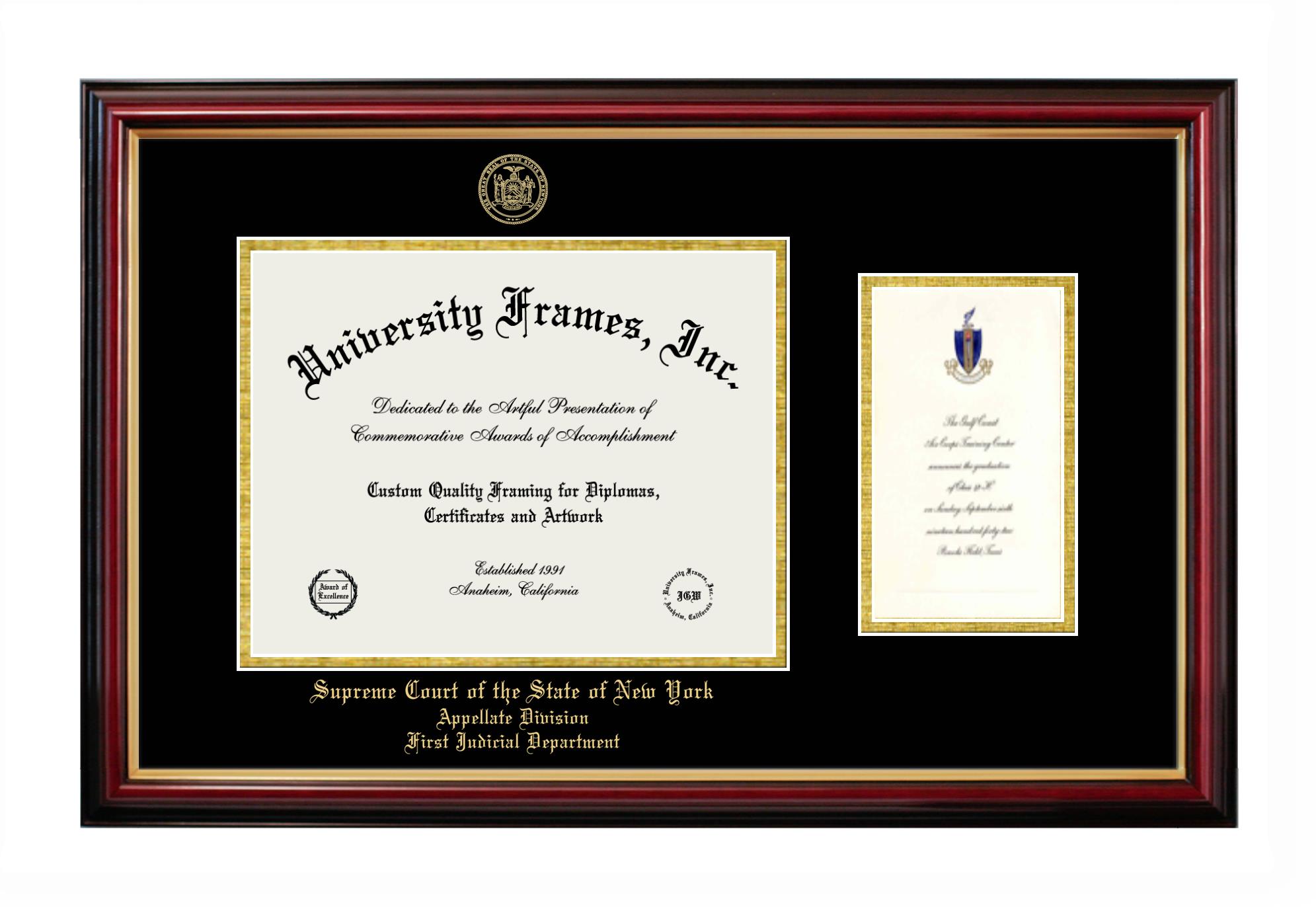 Want a professional diploma frame to showcase your achievement? Or are you looking for a fantastic graduation gift for a new grad or alum? Our official Supreme Court of the State of New York Appellate Division First Judicial Department diploma frames are the best option to showcase any well-deserved diploma. Handcrafted in the USA, our best-in-class degree frames are custom-designed for the official Supreme Court of the State of New York Appellate Division First Judicial Department diploma. You can customize your frame with our hassle-free online design tool. Start customizing your diploma frame now!