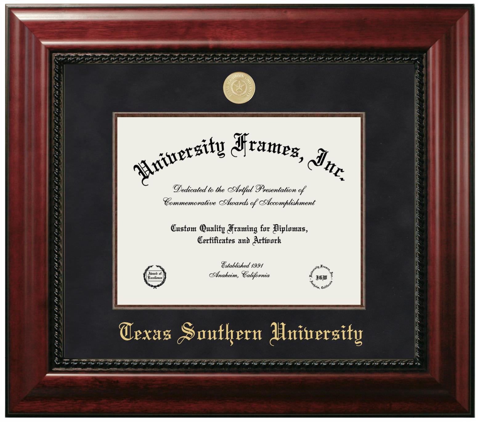 Want a professional diploma frame to showcase your achievement? Or are you looking for a fantastic graduation gift for a new grad or alum? Our official Texas Southern University diploma frames are the best option to showcase any well-deserved diploma. Handcrafted in the USA, our best-in-class degree frames are custom-designed for the official Texas Southern University diploma. You can customize your frame with our hassle-free online design tool. Start customizing your diploma frame now!