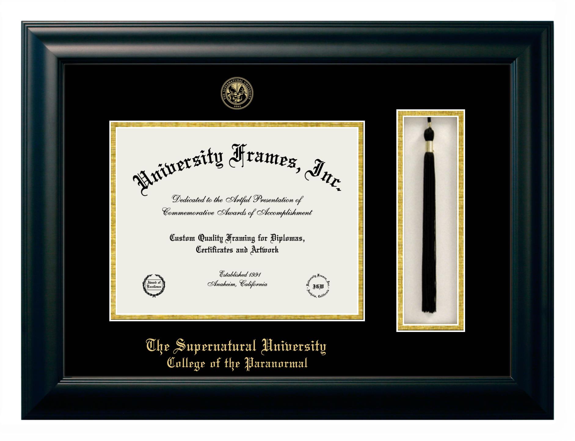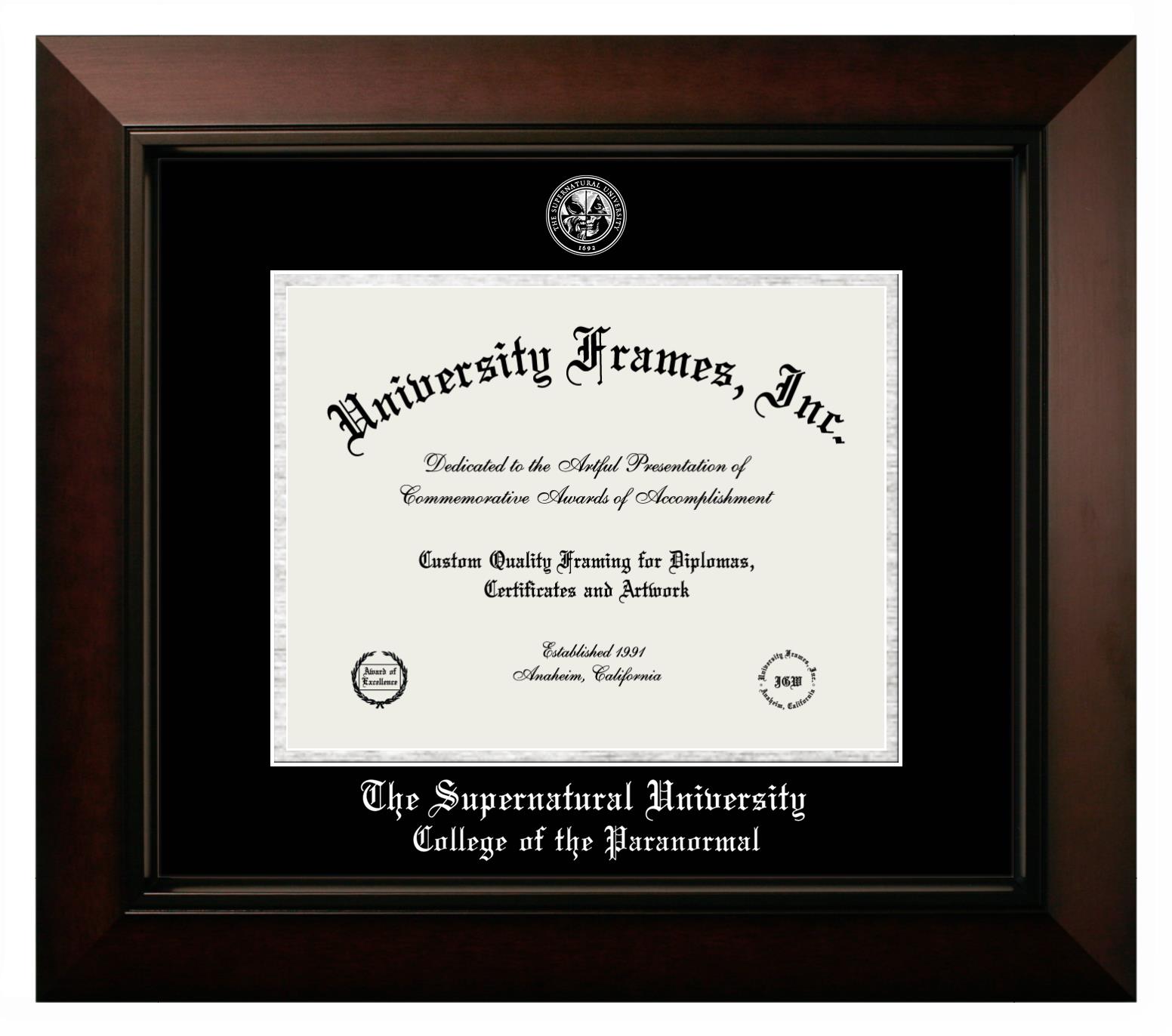 Are you a The Supernatural University College of the Paranormal graduate looking for an officially licensed diploma frame to showcase your achievement? Or, are you looking for a unique graduation gift for a recent The Supernatural University College of the Paranormal graduate or alum? You have come to the right place! Our officially licensed custom diploma frames have the original seal of The Supernatural University College of the Paranormal. Each of our degree frames is handcrafted to offer the highest quality and precision. You can easily customize your graduation frames according to your style and preference. Start customizing your college diploma frame now!