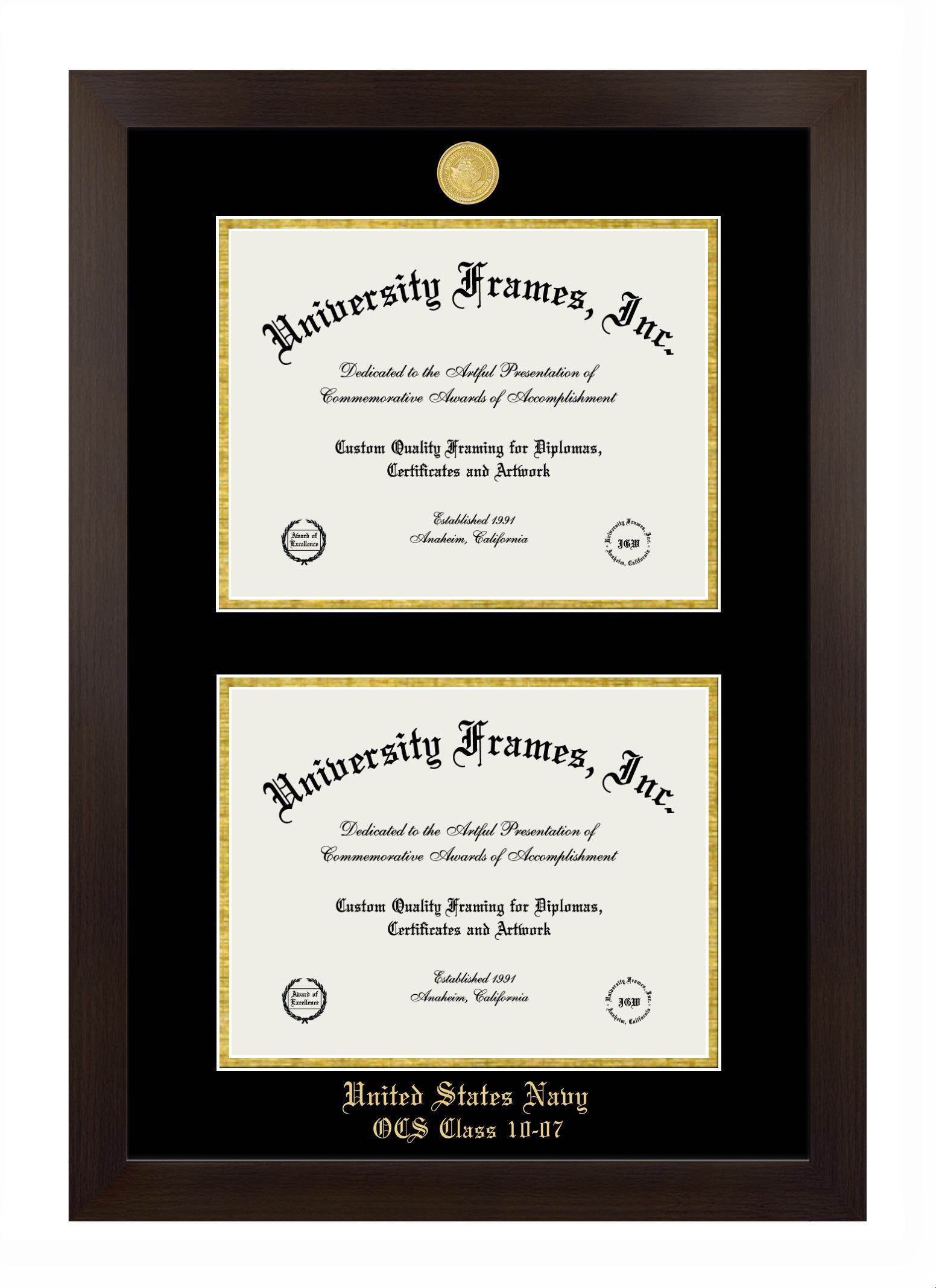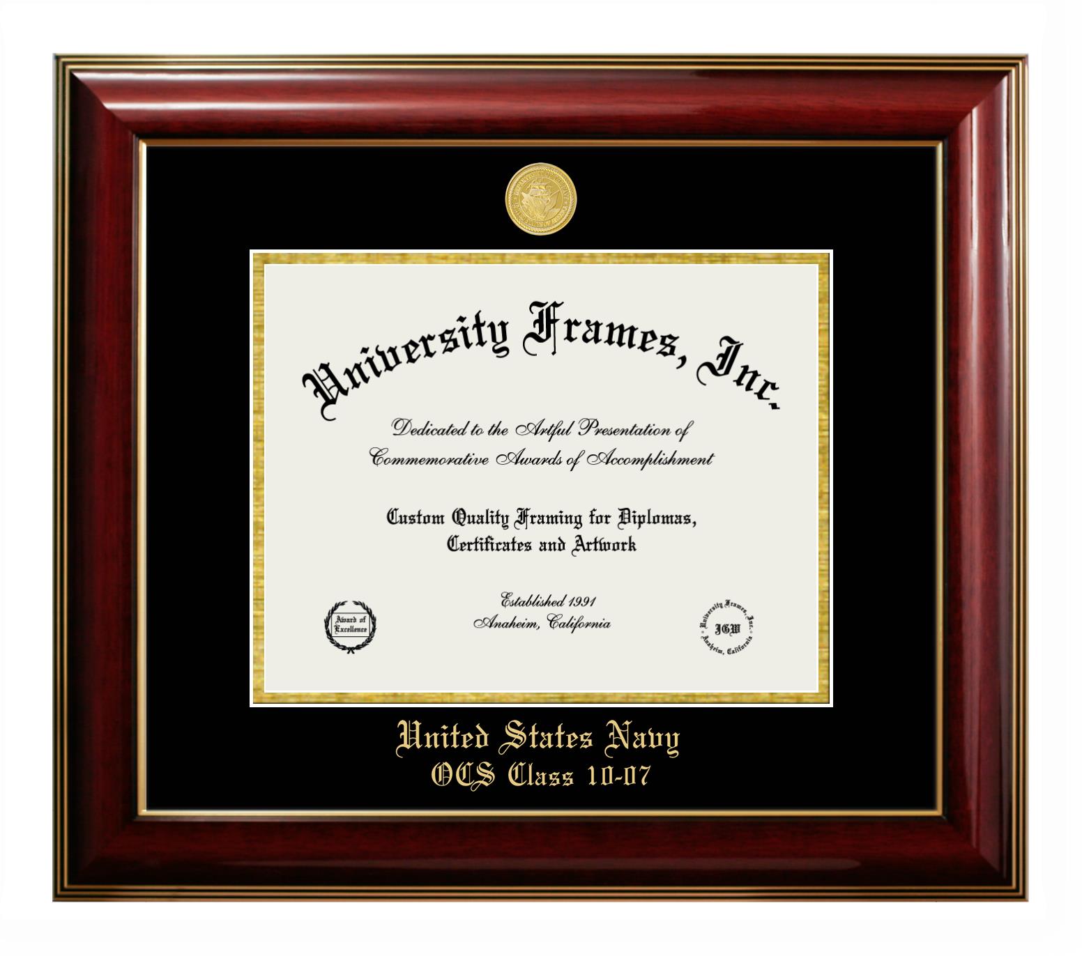 Are you a recent United States Navy OCS Class 10-07 graduate or are you looking for a special graduation gift idea for a recent grad? Our official United States Navy OCS Class 10-07 diploma frames and degree frames are perfect for preserving and displaying any hard-earned diploma. Our custom diploma frames are specifically made with the official United States Navy OCS Class 10-07 seal and are handcrafted with the utmost attention to detail. Start building your graduation frame now!