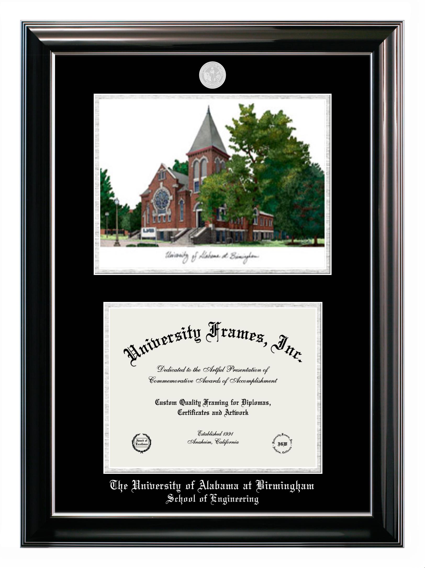 Are you a recent University of Alabama at Birmingham School of Engineering graduate or are you looking for a special graduation gift idea for a recent grad? Our official University of Alabama at Birmingham School of Engineering diploma frames and degree frames are perfect for preserving and displaying any hard-earned diploma. Our custom diploma frames are specifically made with the official University of Alabama at Birmingham School of Engineering seal and are handcrafted with the utmost attention to detail. Start building your graduation frame now!