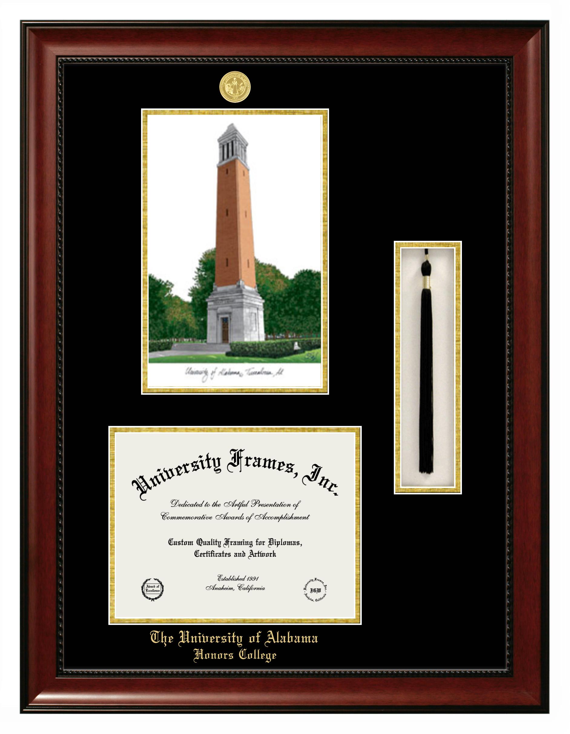 Are you a recent University of Alabama (Tuscaloosa) Honors College graduate or are you looking for a special graduation gift idea for a recent grad? Our official University of Alabama (Tuscaloosa) Honors College diploma frames and degree frames are perfect for preserving and displaying any hard-earned diploma. Our custom diploma frames are specifically made with the official University of Alabama (Tuscaloosa) Honors College seal and are handcrafted with the utmost attention to detail. Start building your graduation frame now!