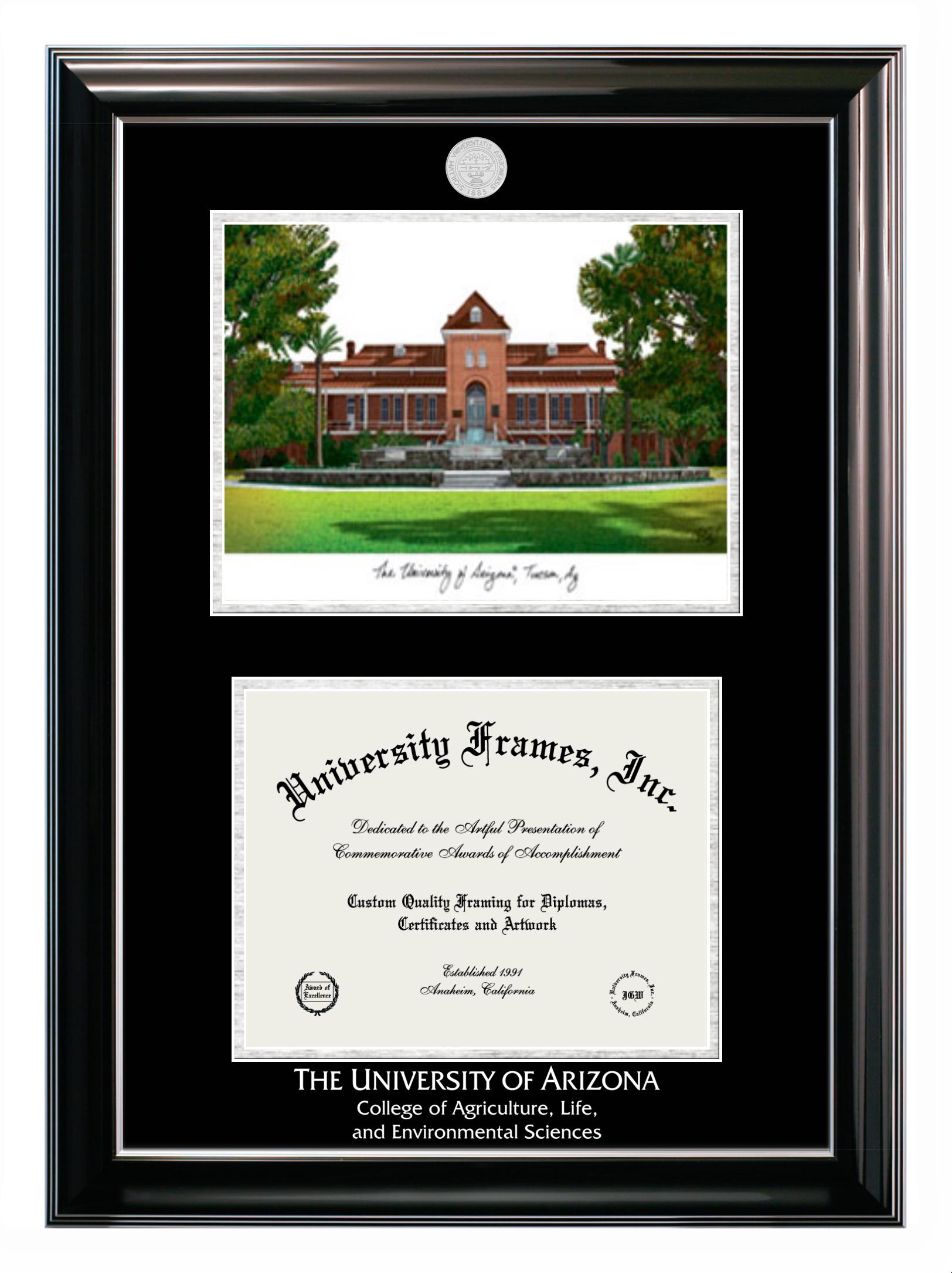 Are you a recent University of Arizona College of Agriculture, Life, and Environmental Sciences graduate or are you looking for a special graduation gift idea for a recent grad? Our official University of Arizona College of Agriculture, Life, and Environmental Sciences diploma frames and degree frames are perfect for preserving and displaying any hard-earned diploma. Our custom diploma frames are specifically made with the official University of Arizona College of Agriculture, Life, and Environmental Sciences seal and are handcrafted with the utmost attention to detail. Start building your graduation frame now!