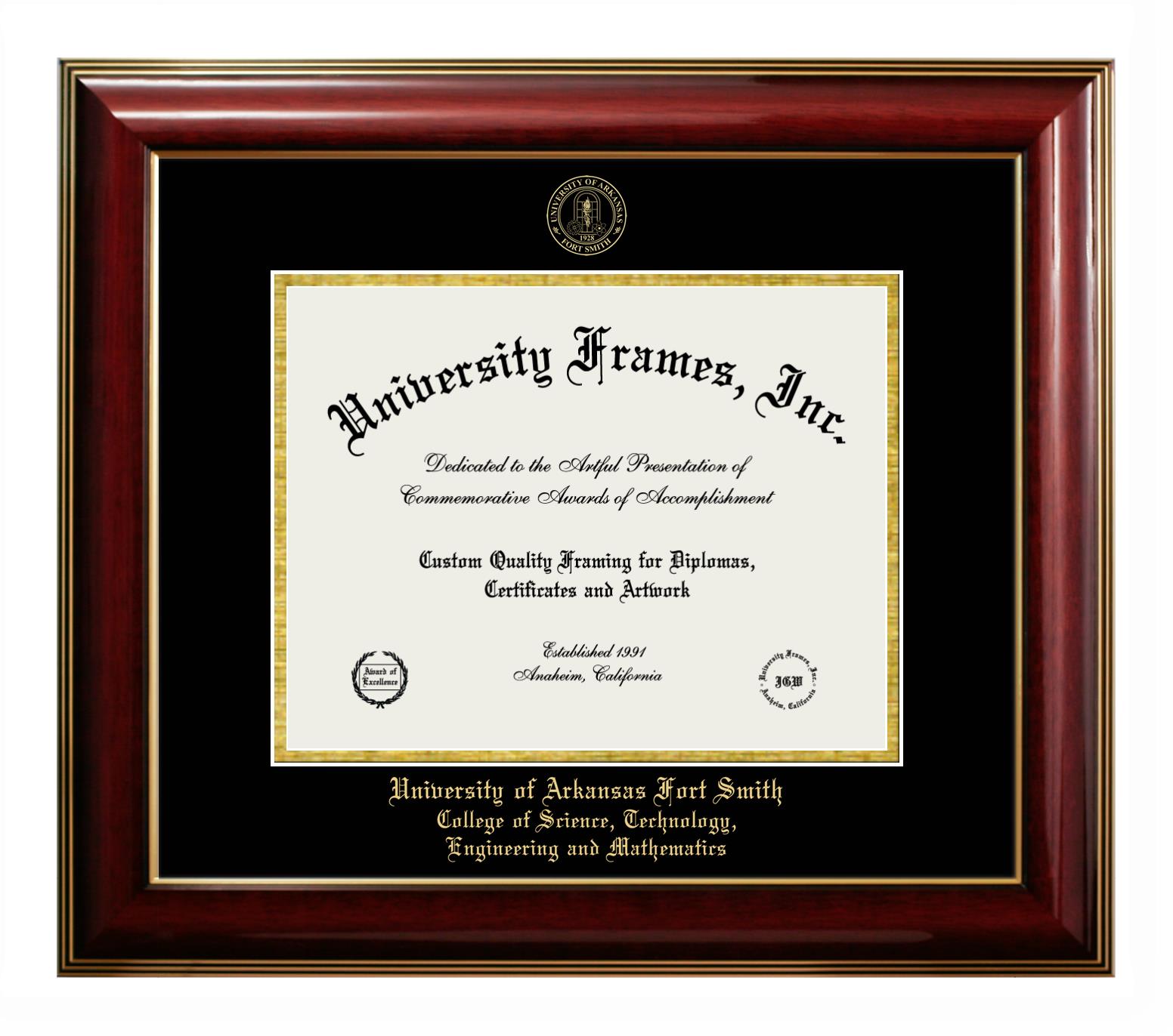 Are you a recent University of Arkansas Fort Smith College of Science, Technology, Engineering and Mathematics graduate or are you looking for a special graduation gift idea for a recent grad? Our official University of Arkansas Fort Smith College of Science, Technology, Engineering and Mathematics diploma frames and degree frames are perfect for preserving and displaying any hard-earned diploma. Our custom diploma frames are specifically made with the official University of Arkansas Fort Smith College of Science, Technology, Engineering and Mathematics seal and are handcrafted with the utmost attention to detail. Start building your graduation frame now!