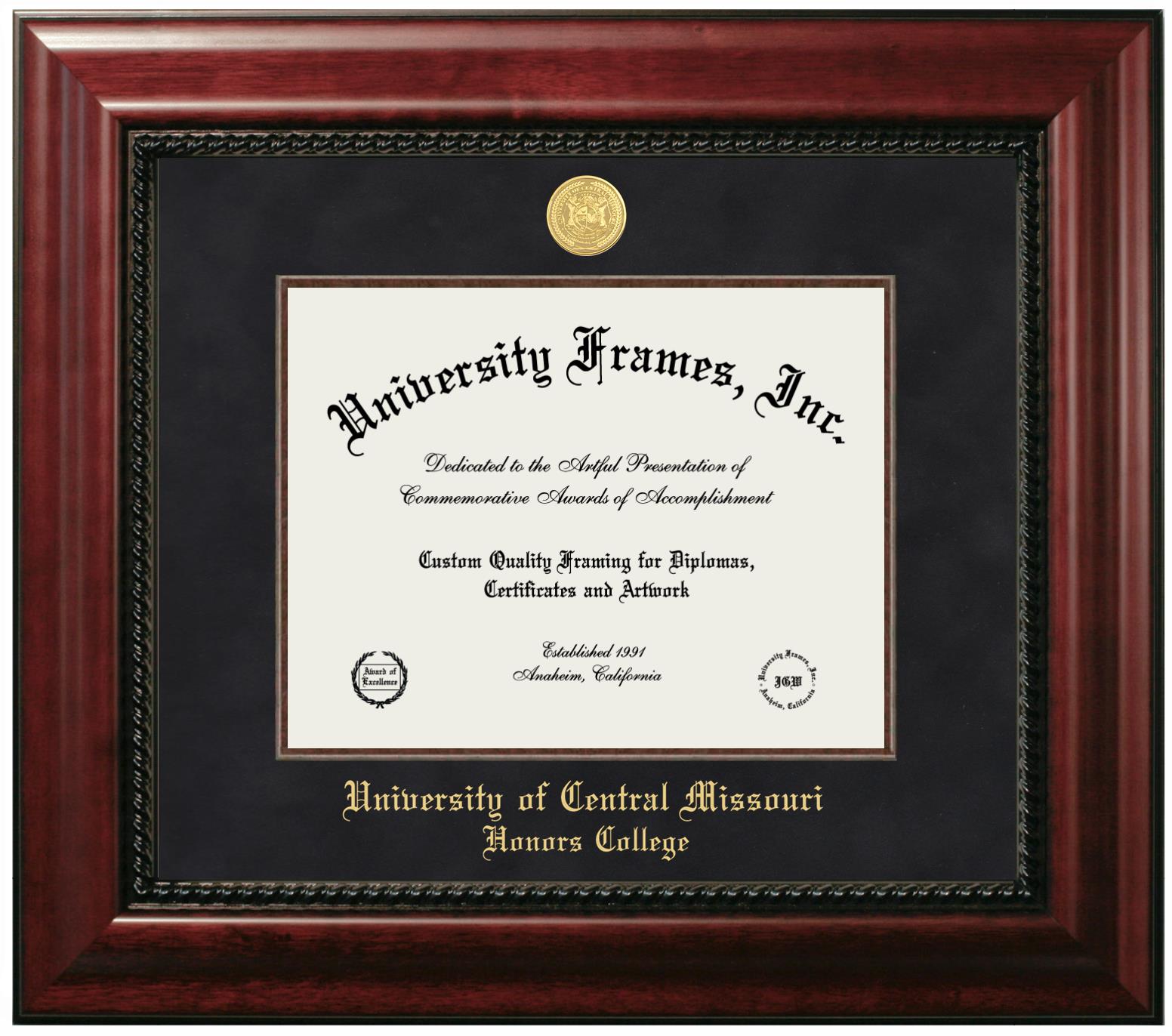 Are you a recent University of Central Missouri Honors College graduate or are you looking for a special graduation gift idea for a recent grad? Our official University of Central Missouri Honors College diploma frames and degree frames are perfect for preserving and displaying any hard-earned diploma. Our custom diploma frames are specifically made with the official University of Central Missouri Honors College seal and are handcrafted with the utmost attention to detail. Start building your graduation frame now!