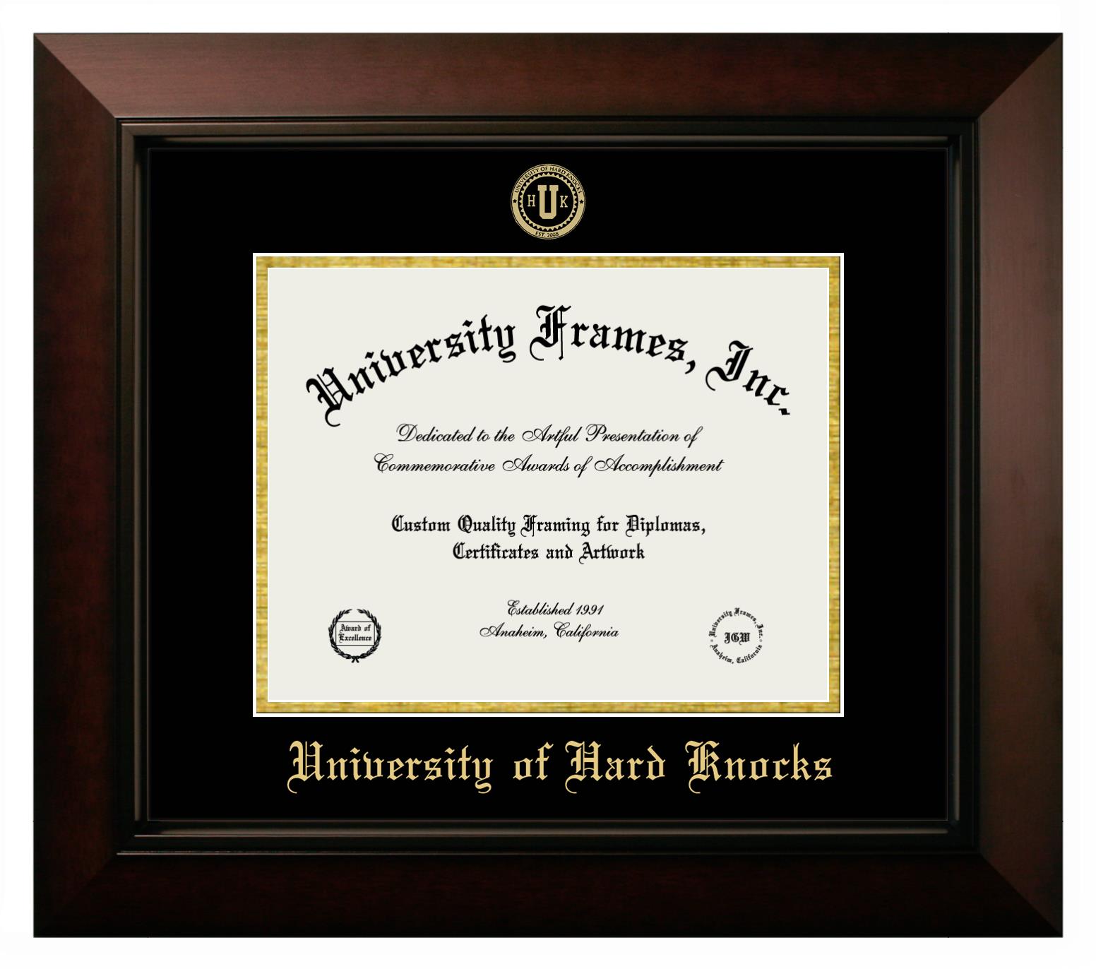 Are you a recent University of Hard Knocks graduate or are you looking for a special graduation gift idea for a recent grad? Our official University of Hard Knocks diploma frames and degree frames are perfect for preserving and displaying any hard-earned diploma. Our custom diploma frames are specifically made with the official University of Hard Knocks seal and are handcrafted with the utmost attention to detail. Start building your graduation frame now!