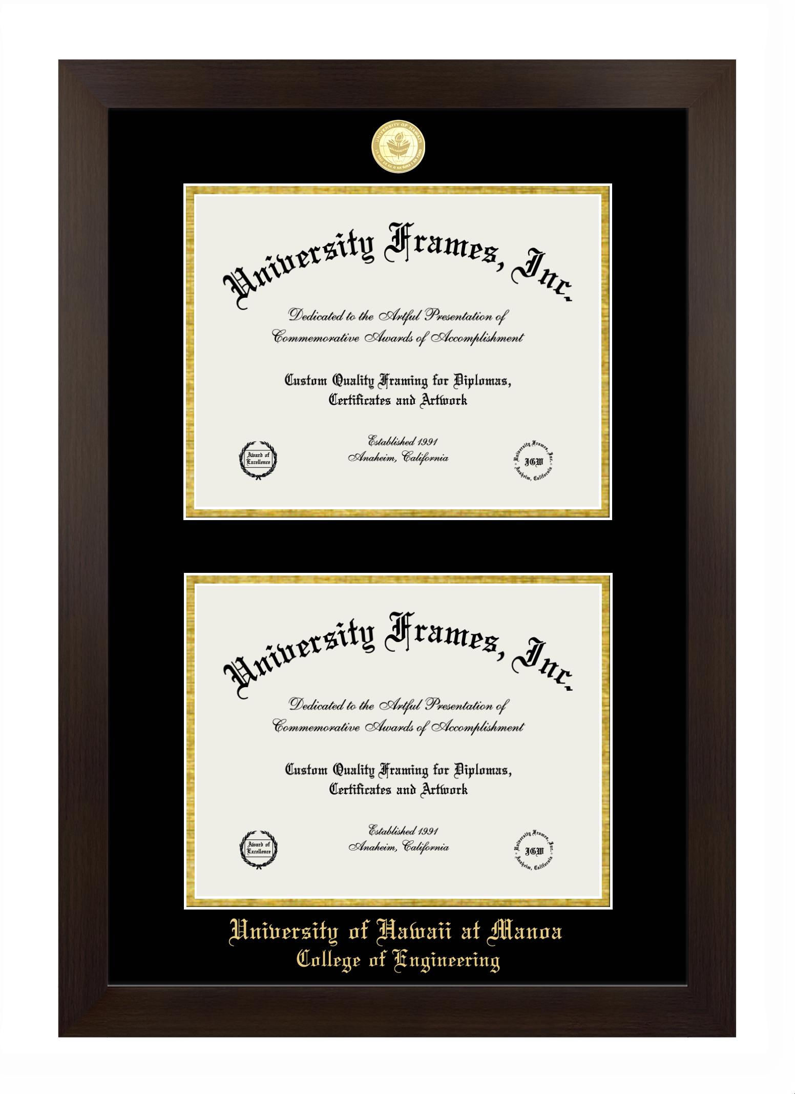 Hey there, University of Hawaii at Manoa College of Engineering grads. Congratulations for your accomplishment! Since you’re here, you must be looking for a professional graduation frame to preserve and showcase your University of Hawaii at Manoa College of Engineering diploma. Or, you may be looking for a diploma frame for another grad. We at University Frames, create the finest diploma frames and are licensed with University of Hawaii at Manoa College of Engineering. Each of our degree frames is handcrafted in the US using the finest hardwood and with an exemplary level of attention to detail. Customize your diploma frame using our easy and intuitive online design tool.