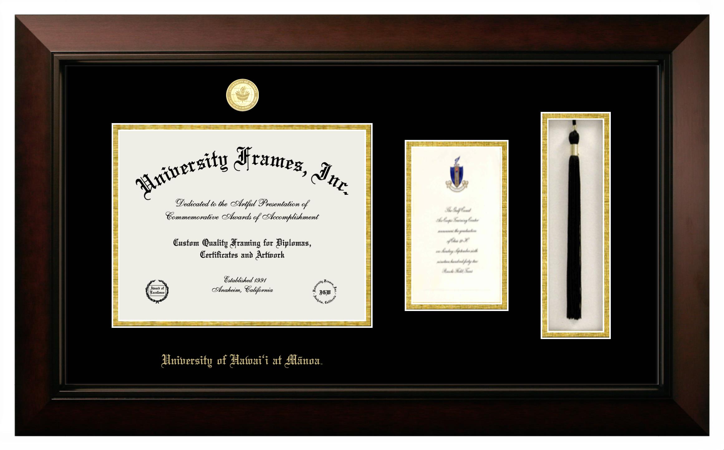 Are you a recent University of Hawaii at Manoa graduate or are you looking for a special graduation gift idea for a recent grad? Our official University of Hawaii at Manoa diploma frames and degree frames are perfect for preserving and displaying any hard-earned diploma. Our custom diploma frames are specifically made with the official University of Hawaii at Manoa seal and are handcrafted with the utmost attention to detail. Start building your graduation frame now!
