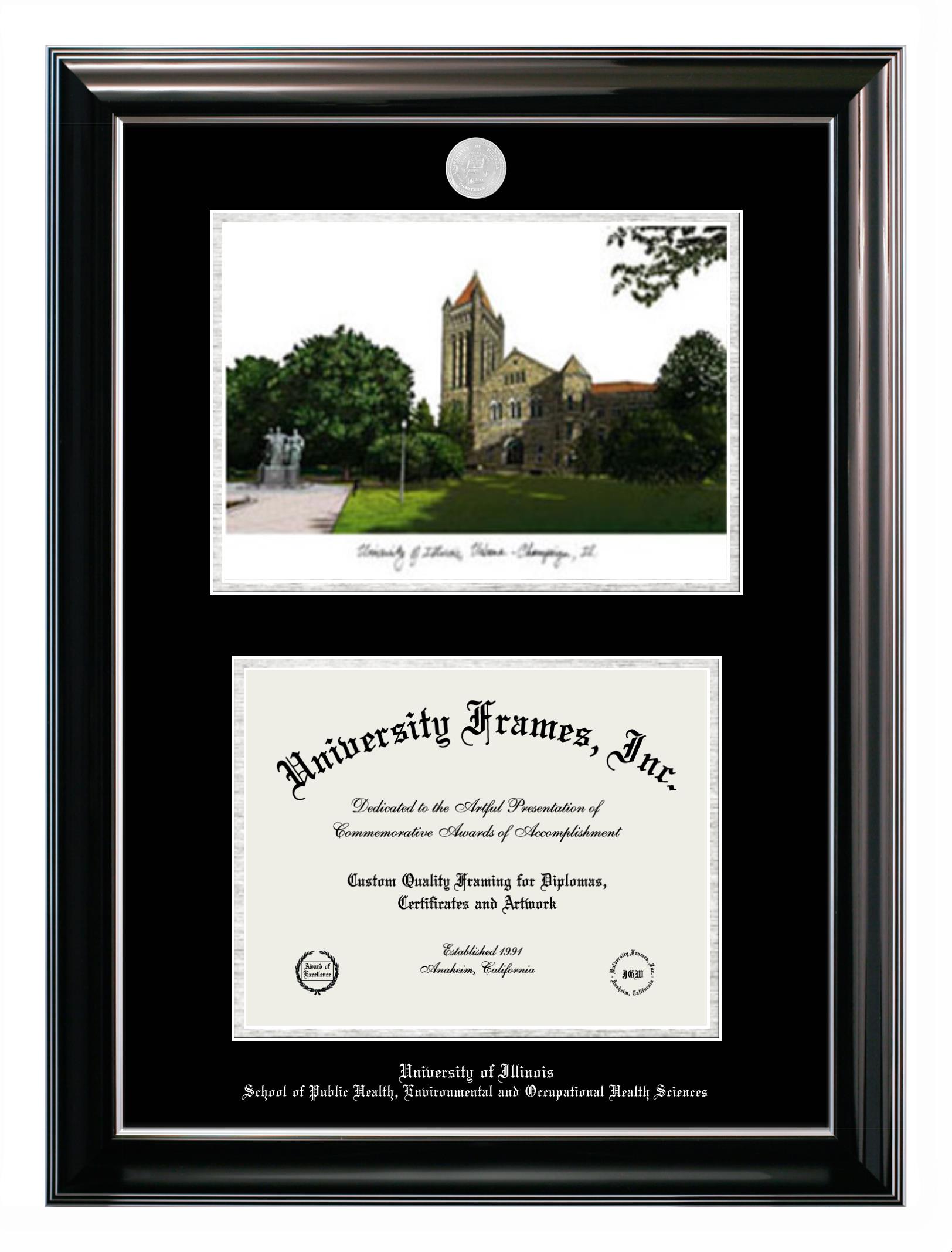We believe that earning a degree is a huge accomplishment and showcasing it is important. Therefore, if you are looking for University of Illinois School of Public Health, Environmental and Occupational Health Sciences diploma or degree frames for yourself or a recent University of Illinois School of Public Health, Environmental and Occupational Health Sciences grad, we are sure you will love our custom diploma frames. Our diploma frames are made with the official University of Illinois School of Public Health, Environmental and Occupational Health Sciences seal and are beautifully crafted. Start designing your frame now!