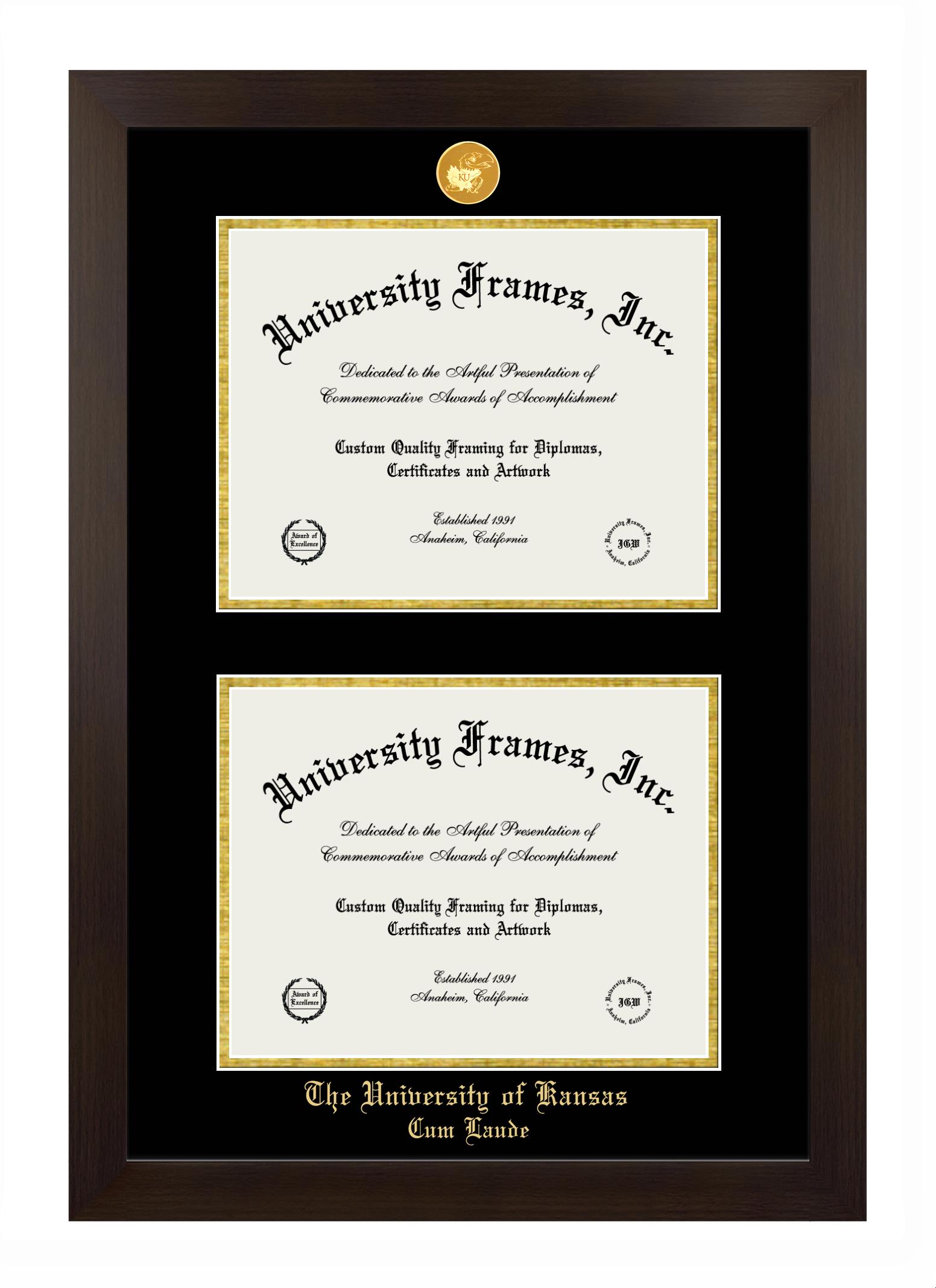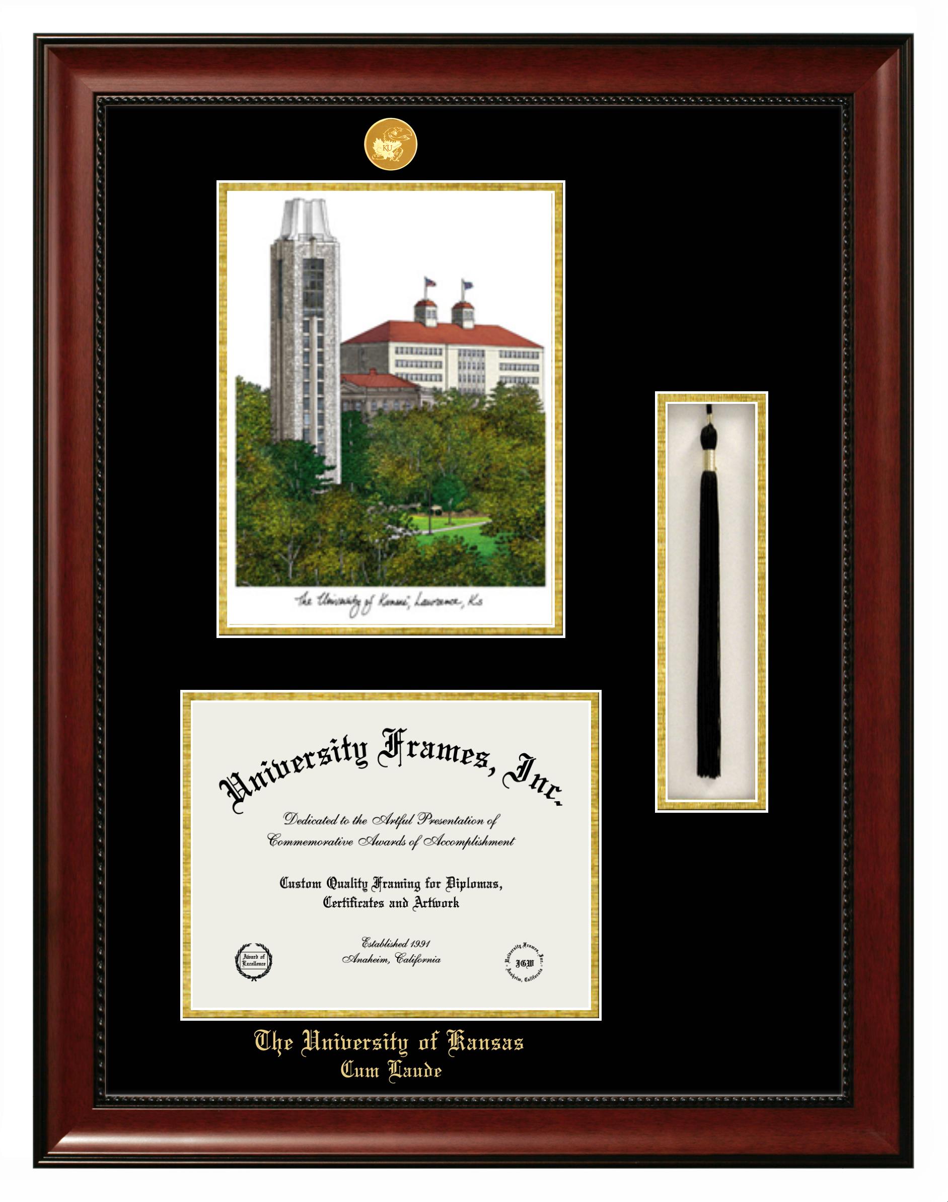 We believe that earning a degree is a huge accomplishment and showcasing it is important. Therefore, if you are looking for University of Kansas Cum Laude diploma or degree frames for yourself or a recent University of Kansas Cum Laude grad, we are sure you will love our custom diploma frames. Our diploma frames are made with the official University of Kansas Cum Laude seal and are beautifully crafted. Start designing your frame now!