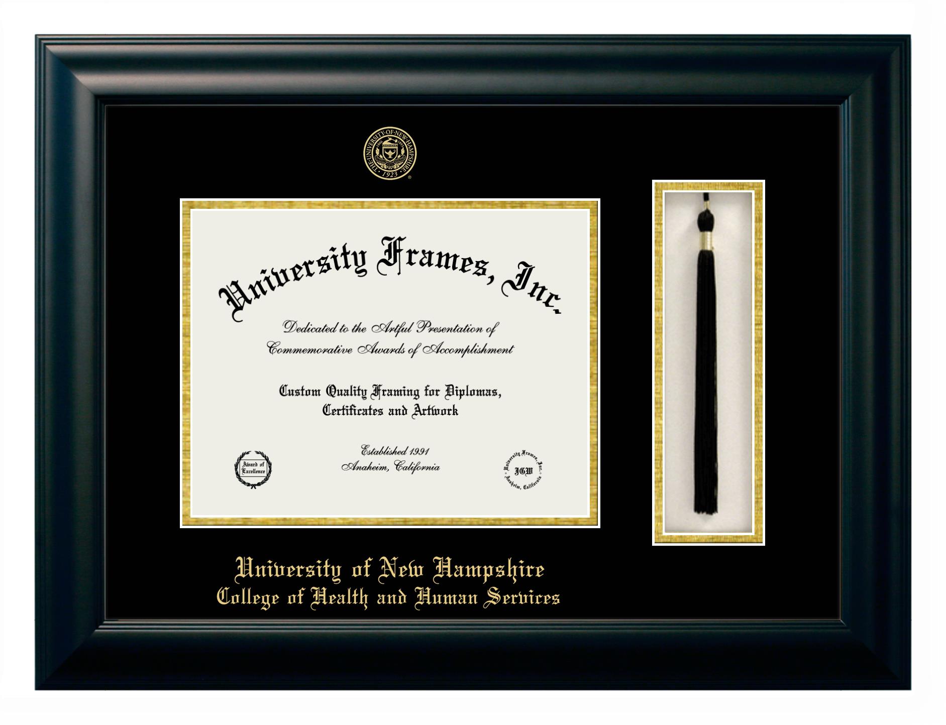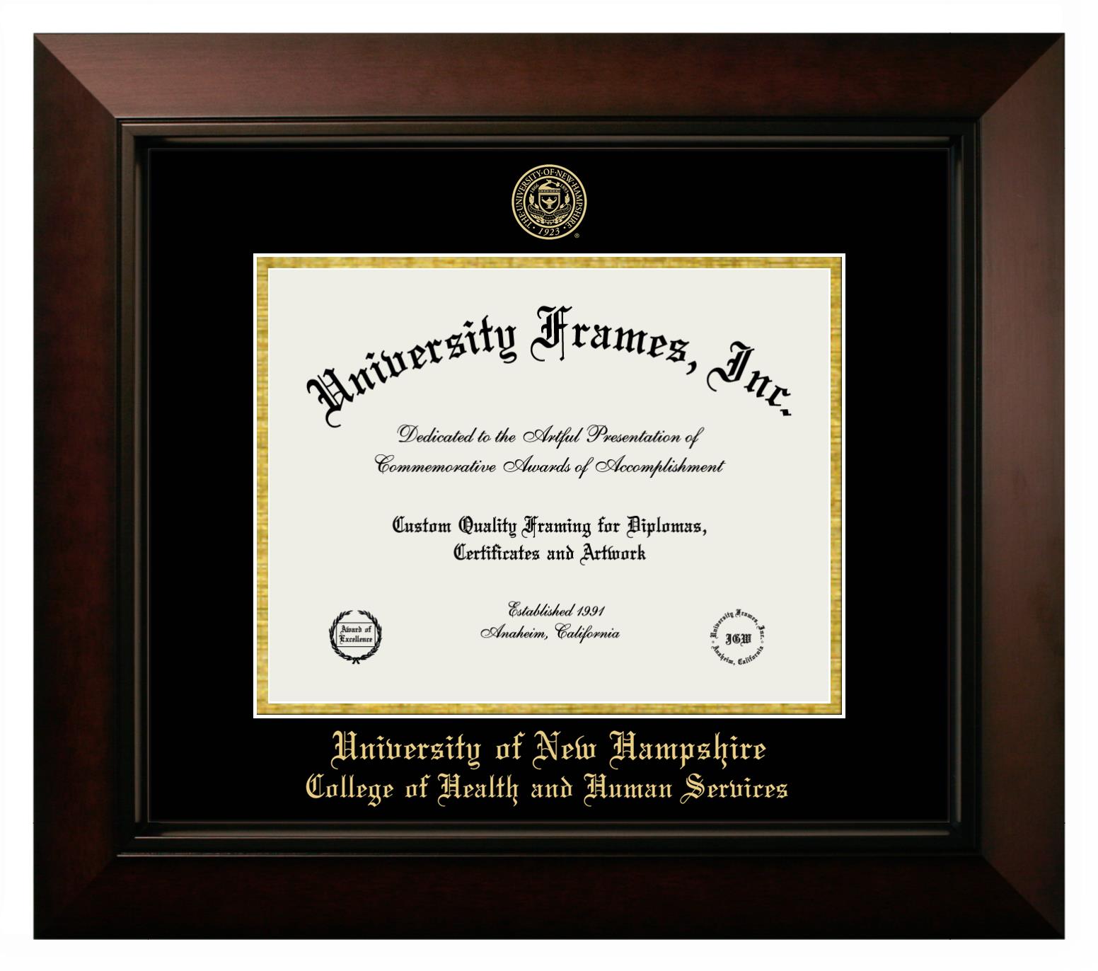 We believe that earning a degree is a huge accomplishment and showcasing it is important. Therefore, if you are looking for University of New Hampshire College of Health and Human Services diploma or degree frames for yourself or a recent University of New Hampshire College of Health and Human Services grad, we are sure you will love our custom diploma frames. Our diploma frames are made with the official University of New Hampshire College of Health and Human Services seal and are beautifully crafted. Start designing your frame now!