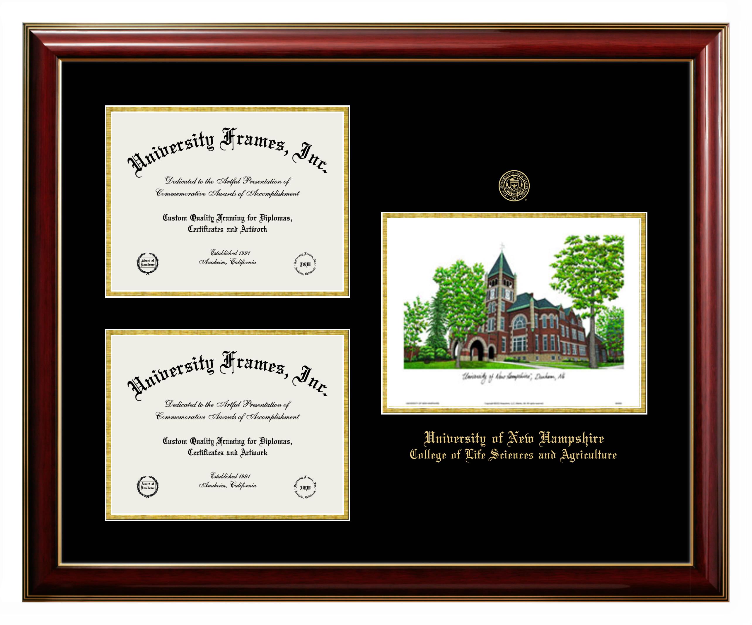 We believe that earning a degree is a huge accomplishment and showcasing it is important. Therefore, if you are looking for University of New Hampshire College of Life Sciences and Agriculture diploma or degree frames for yourself or a recent University of New Hampshire College of Life Sciences and Agriculture grad, we are sure you will love our custom diploma frames. Our diploma frames are made with the official University of New Hampshire College of Life Sciences and Agriculture seal and are beautifully crafted. Start designing your frame now!