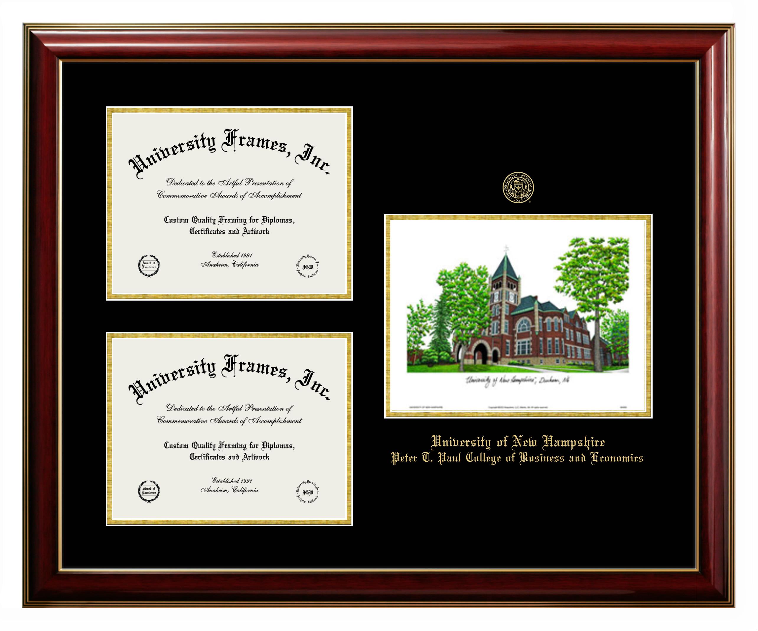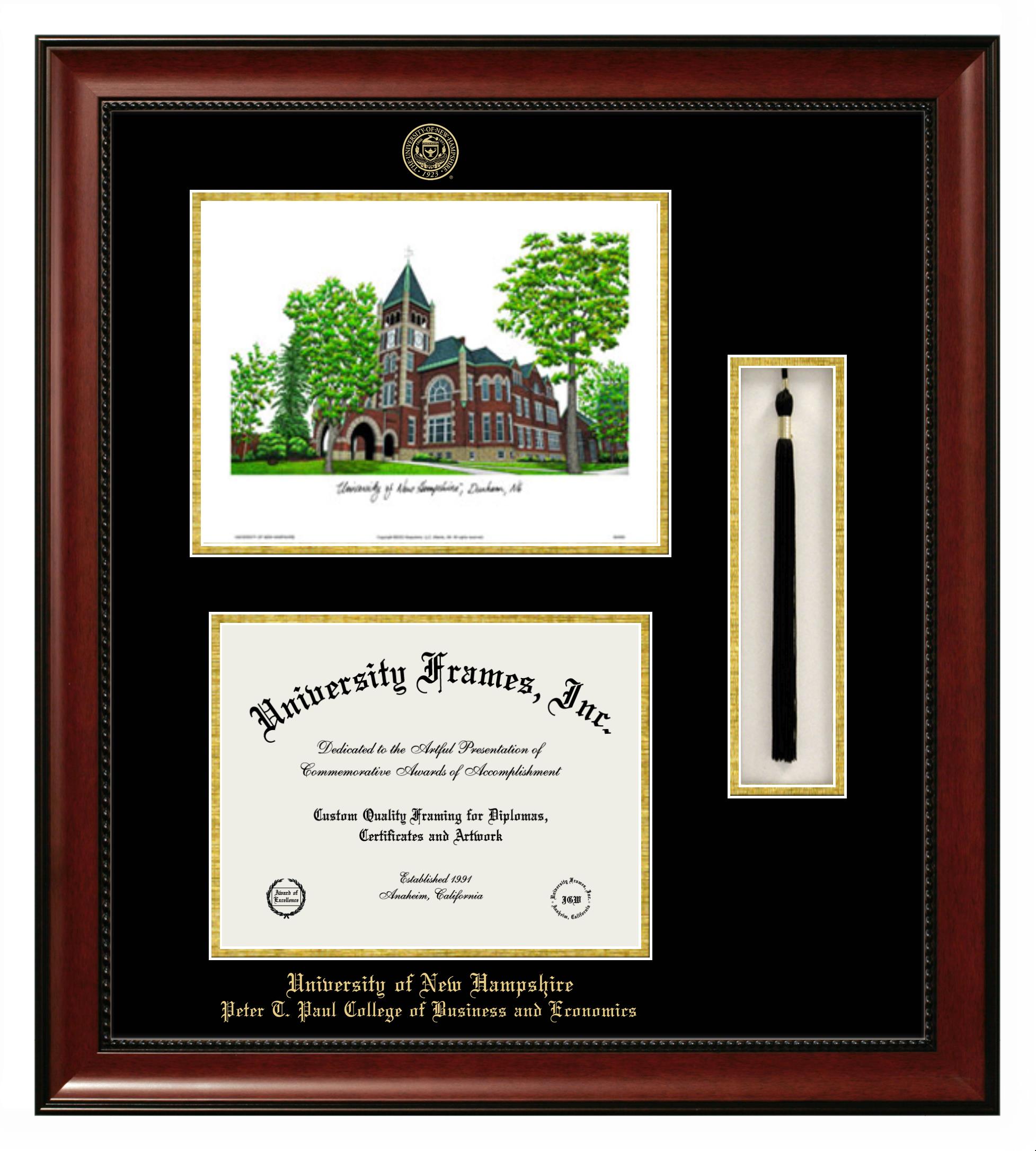 We believe that earning a degree is a huge accomplishment and showcasing it is important. Therefore, if you are looking for University of New Hampshire Peter T. Paul College of Business and Economics diploma or degree frames for yourself or a recent University of New Hampshire Peter T. Paul College of Business and Economics grad, we are sure you will love our custom diploma frames. Our diploma frames are made with the official University of New Hampshire Peter T. Paul College of Business and Economics seal and are beautifully crafted. Start designing your frame now!