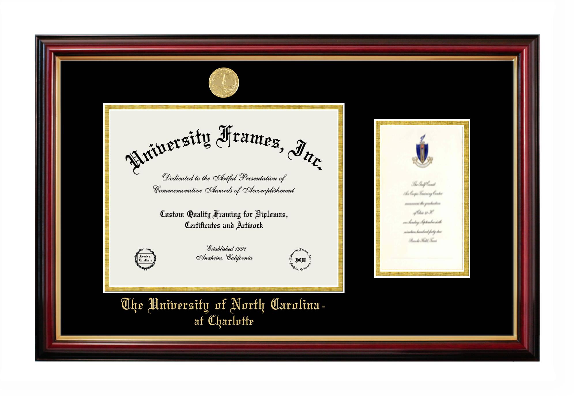 We believe that earning a degree is a huge accomplishment and showcasing it is important. Therefore, if you are looking for University of North Carolina at Charlotte diploma or degree frames for yourself or a recent University of North Carolina at Charlotte grad, we are sure you will love our custom diploma frames. Our diploma frames are made with the official University of North Carolina at Charlotte seal and are beautifully crafted. Start designing your frame now!