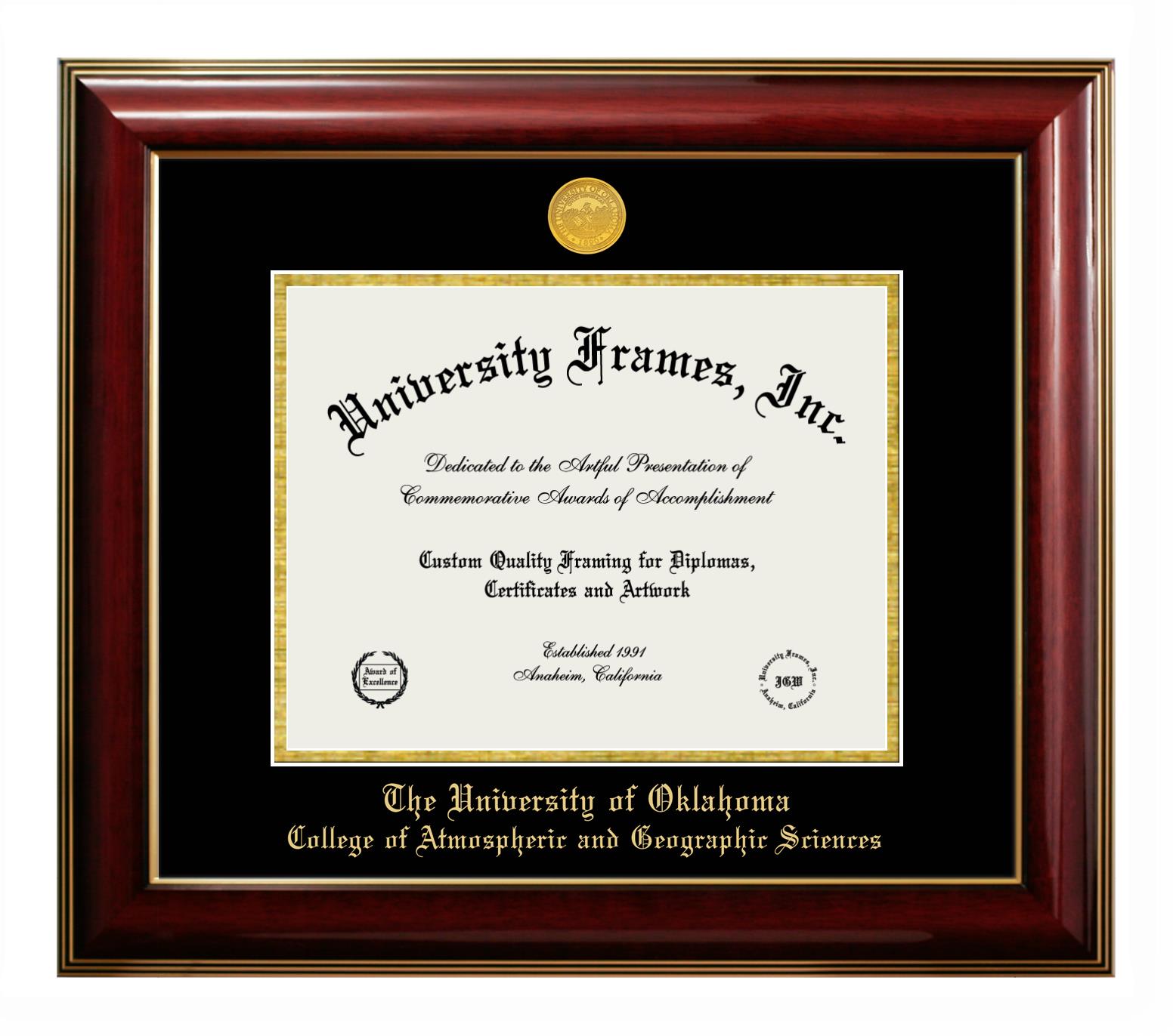 We believe that earning a degree is a huge accomplishment and showcasing it is important. Therefore, if you are looking for University of Oklahoma College of Atmospheric and Geographic Sciences diploma or degree frames for yourself or a recent University of Oklahoma College of Atmospheric and Geographic Sciences grad, we are sure you will love our custom diploma frames. Our diploma frames are made with the official University of Oklahoma College of Atmospheric and Geographic Sciences seal and are beautifully crafted. Start designing your frame now!
