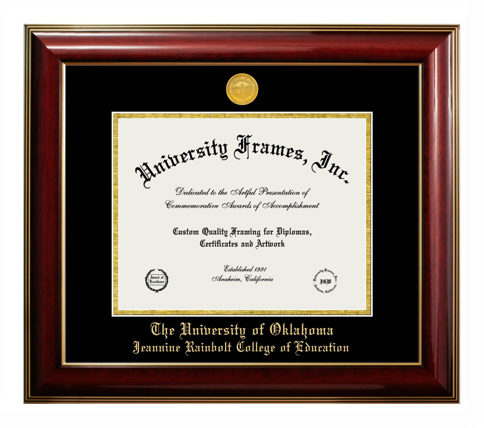 We believe that earning a degree is a huge accomplishment and showcasing it is important. Therefore, if you are looking for University of Oklahoma Jeannine Rainbolt College of Education diploma or degree frames for yourself or a recent University of Oklahoma Jeannine Rainbolt College of Education grad, we are sure you will love our custom diploma frames. Our diploma frames are made with the official University of Oklahoma Jeannine Rainbolt College of Education seal and are beautifully crafted. Start designing your frame now!